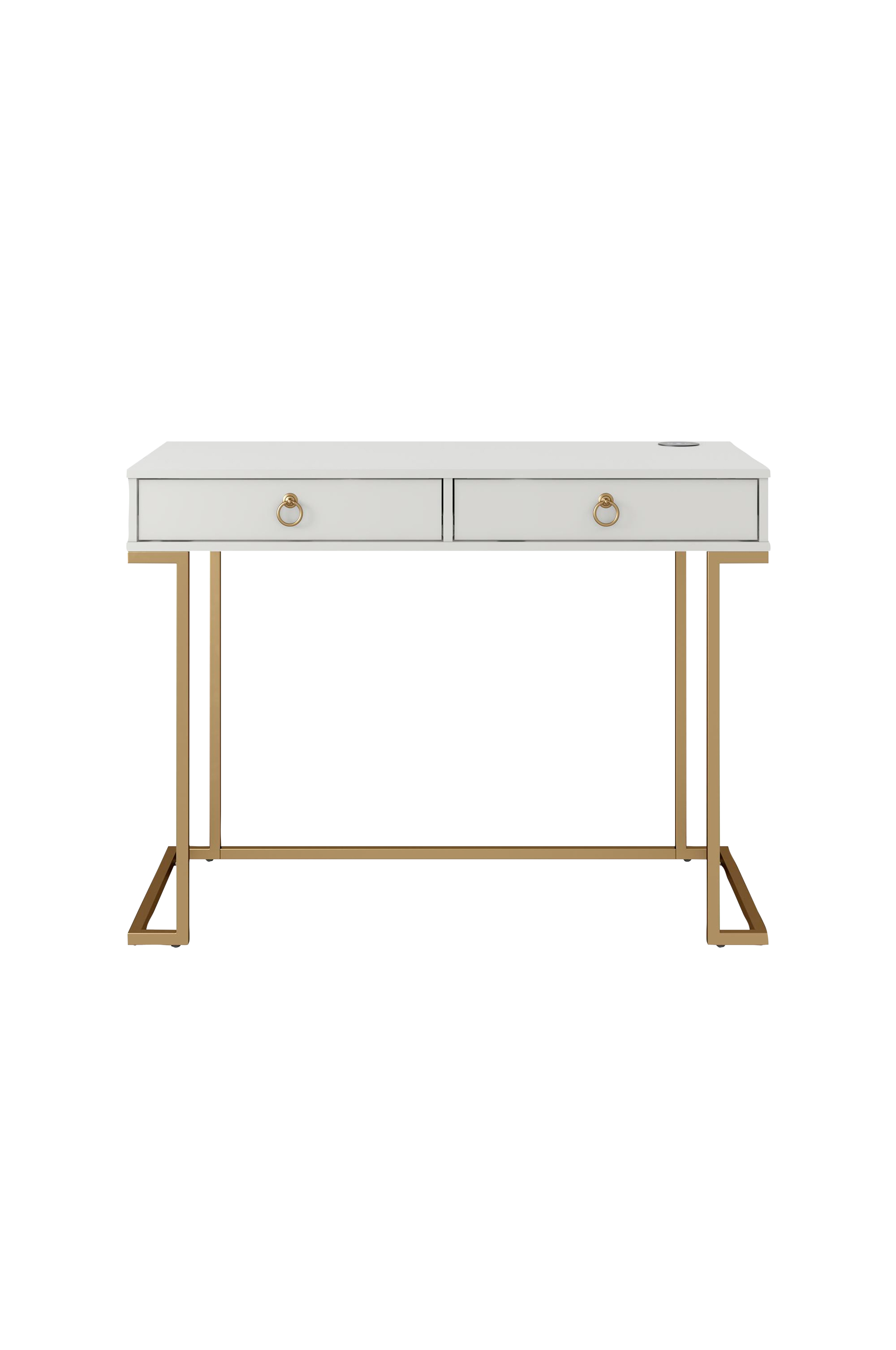 CosmoLiving by Cosmopolitanin Camila Writing Desk -kirjoituspöytä on aivan erityinen. Suorat linjat ja modernit kullanväriset metallijalat luovat ylellisen ilmeen, joka sopii täydellisesti fashionistalle. Kirjoituspöytä on saatavana useissa väreissä, ja sen kaksi laatikkoa tarjoavat runsaasti säilytystilaa. Laatikoissa on kullanväriset vetimet. Ja mikä parasta: Langattoman latausalustan ansiosta lataat matkapuhelimen helposti sen jälkeen, kun olet julkaissut kaikki sisustuskuvasi Instagramissa. Camila-kirjoituspöydän ääressä työskentelet tyylikkäästi!