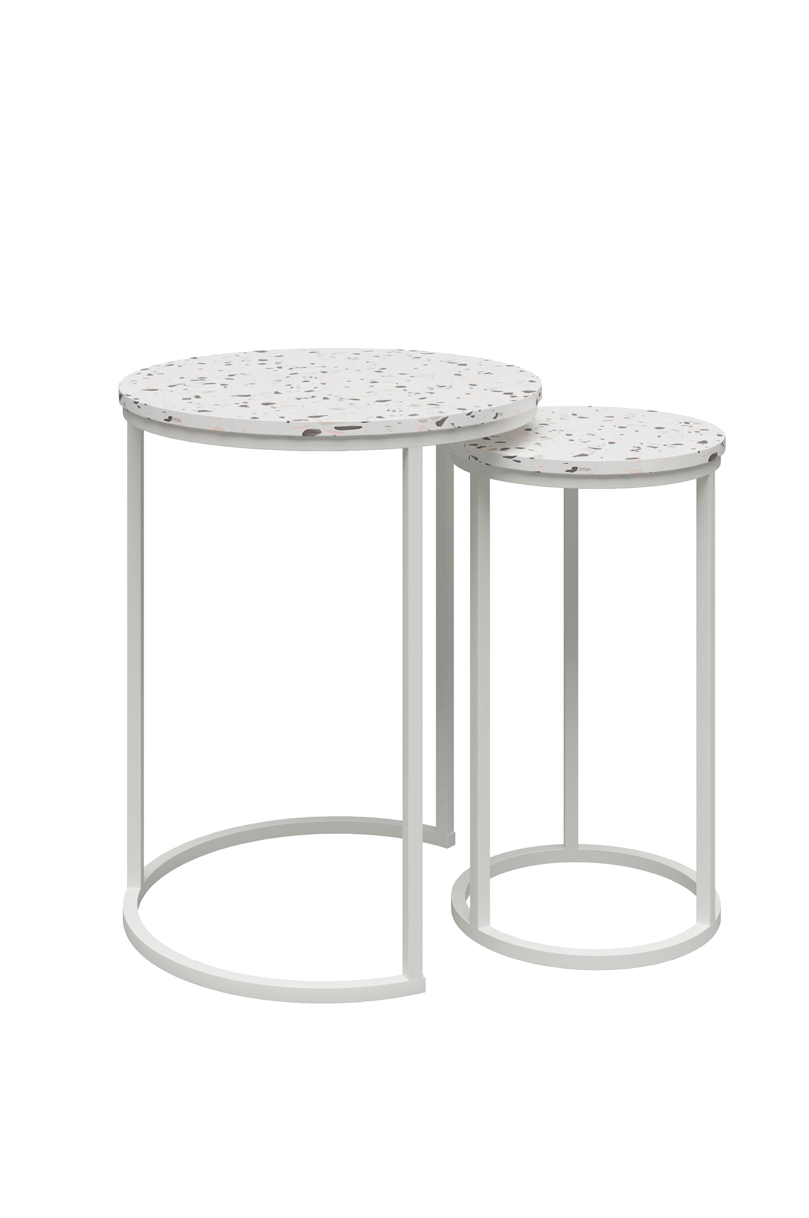 CosmoLiving Amelia Nesting Tables -pöydät ovat jokaisen isännän ja emännän unelma. Kun tarvitset lisää pöytätilaa, käytä molempia pöytiä. Kun tarvitset lisää lattiatilaa, työnnä pieni pöytä helposti isomman alle. Pöydissä on tyylikäs metallirunko ja pöytälevy, joka näyttää joko valkoiselta marmorilta tai terrazzolta.