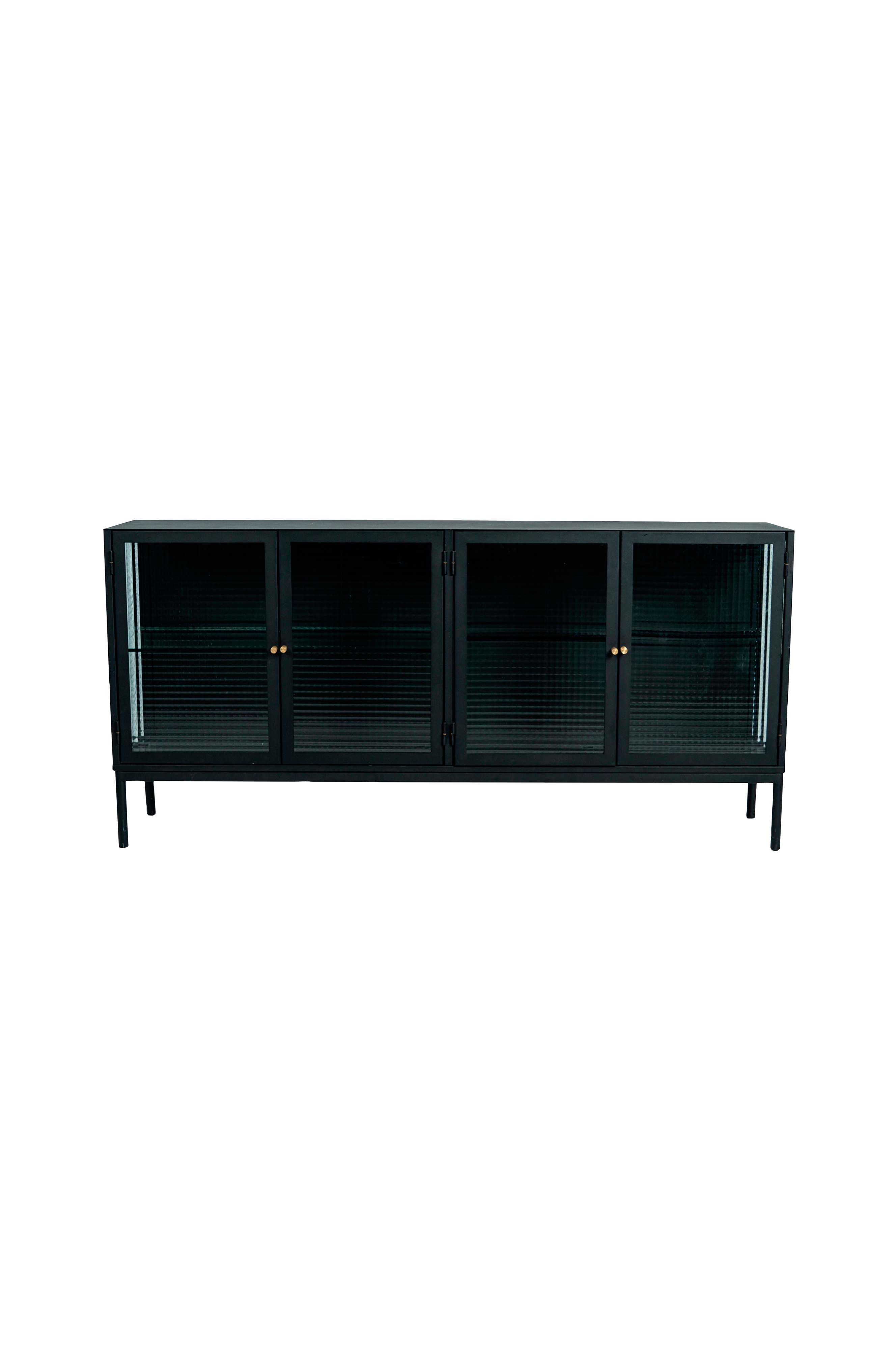 Moderniin teolliseen tyyliin tehty sivupöytä, jonka sivuilla ja ovissa on lasia, joka antaa ihanaa valoa sisään. Sivupöydän mitat ovat 167x80x38 cm.