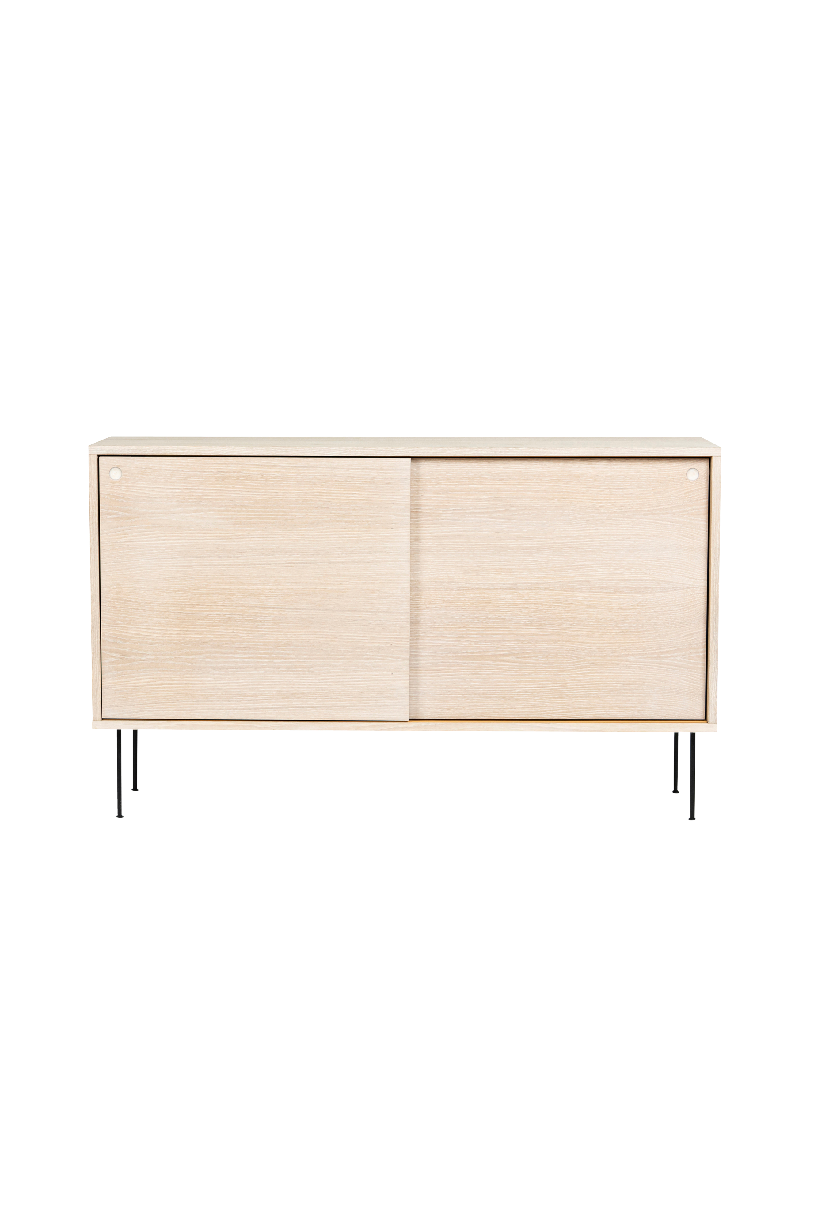Senkin kahden liukuoven takana on säilytystila. Neljä mustaa jauhemaalattua teräsjalkaa. Slide on moderni säilytyskalustesarja, josta on saatavana useita eri malleja. Senkin mitat 132x38x80 cm.