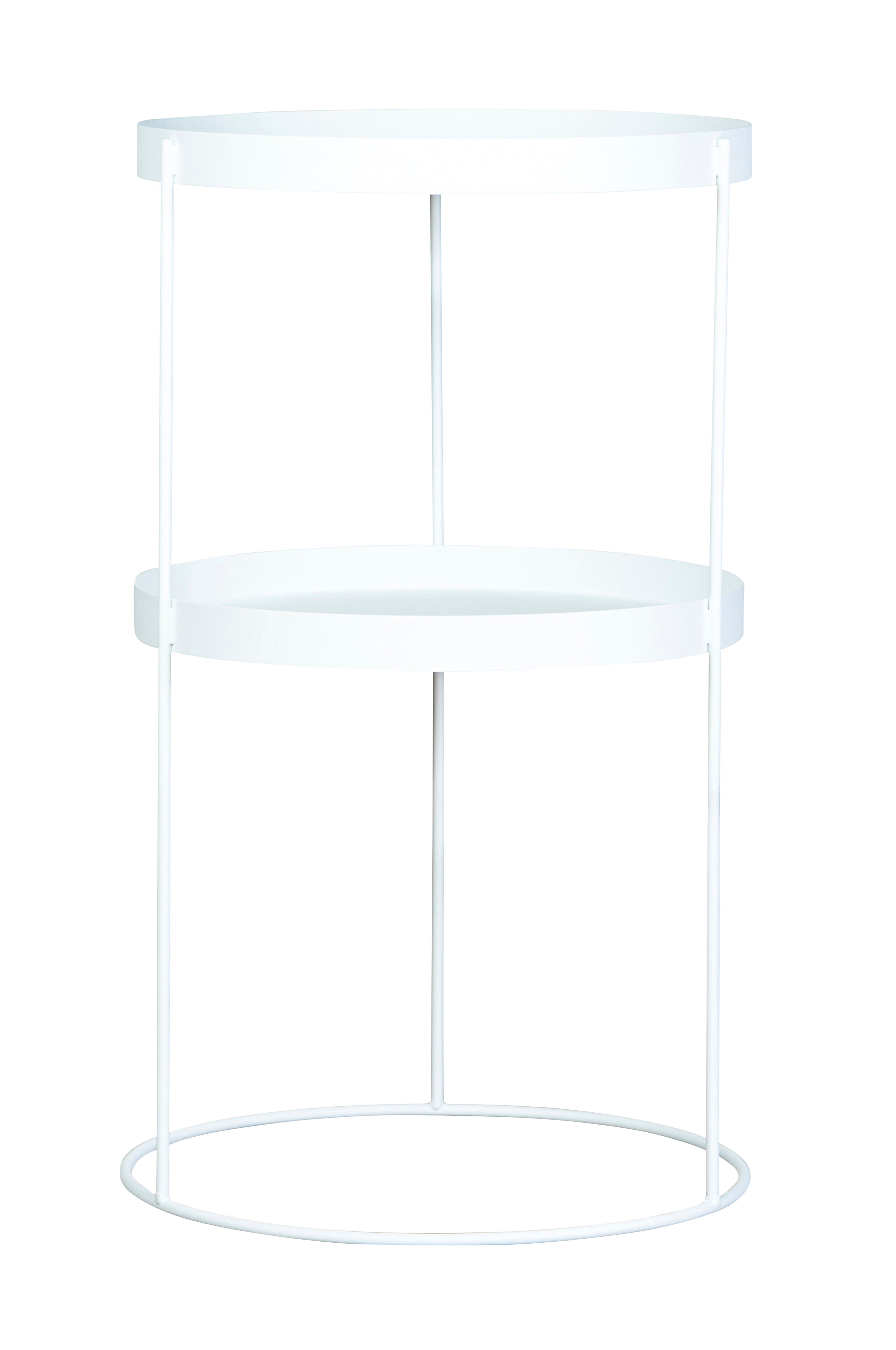 Pyöreä sivupöytä, jossa kaksi hyllytasoa. Täydellinen lisäpöydäksi sohvan viereen tai vaikkapa yöpöydäksi.