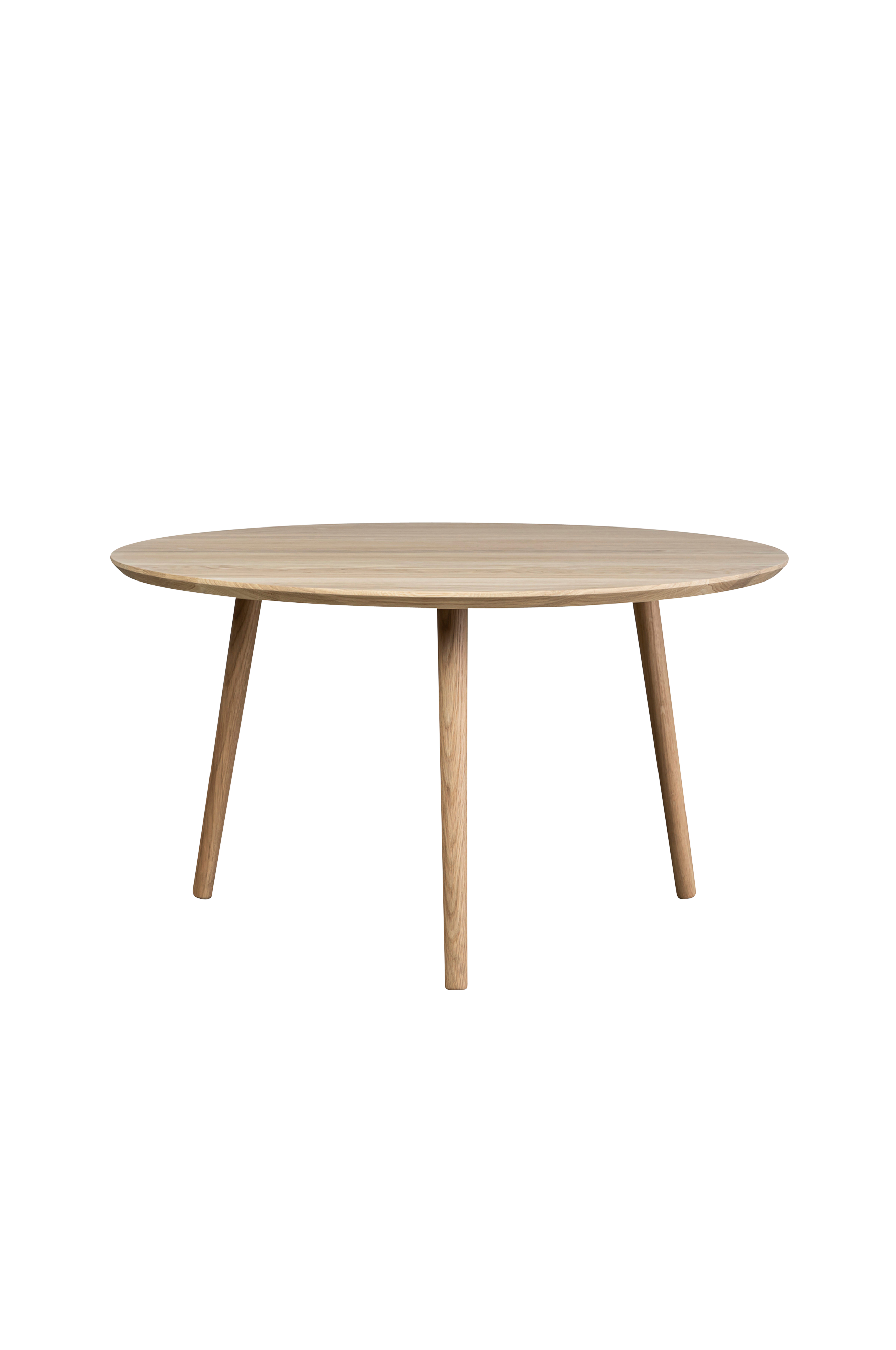 Pyöreä sohvapöytä vaaleaksi öljyttyä massiivitammea. Yksinkertainen ja tyylikäs muotoilu, joka sopii yhteen erilaisten sohvien ja nojatuolien kanssa.