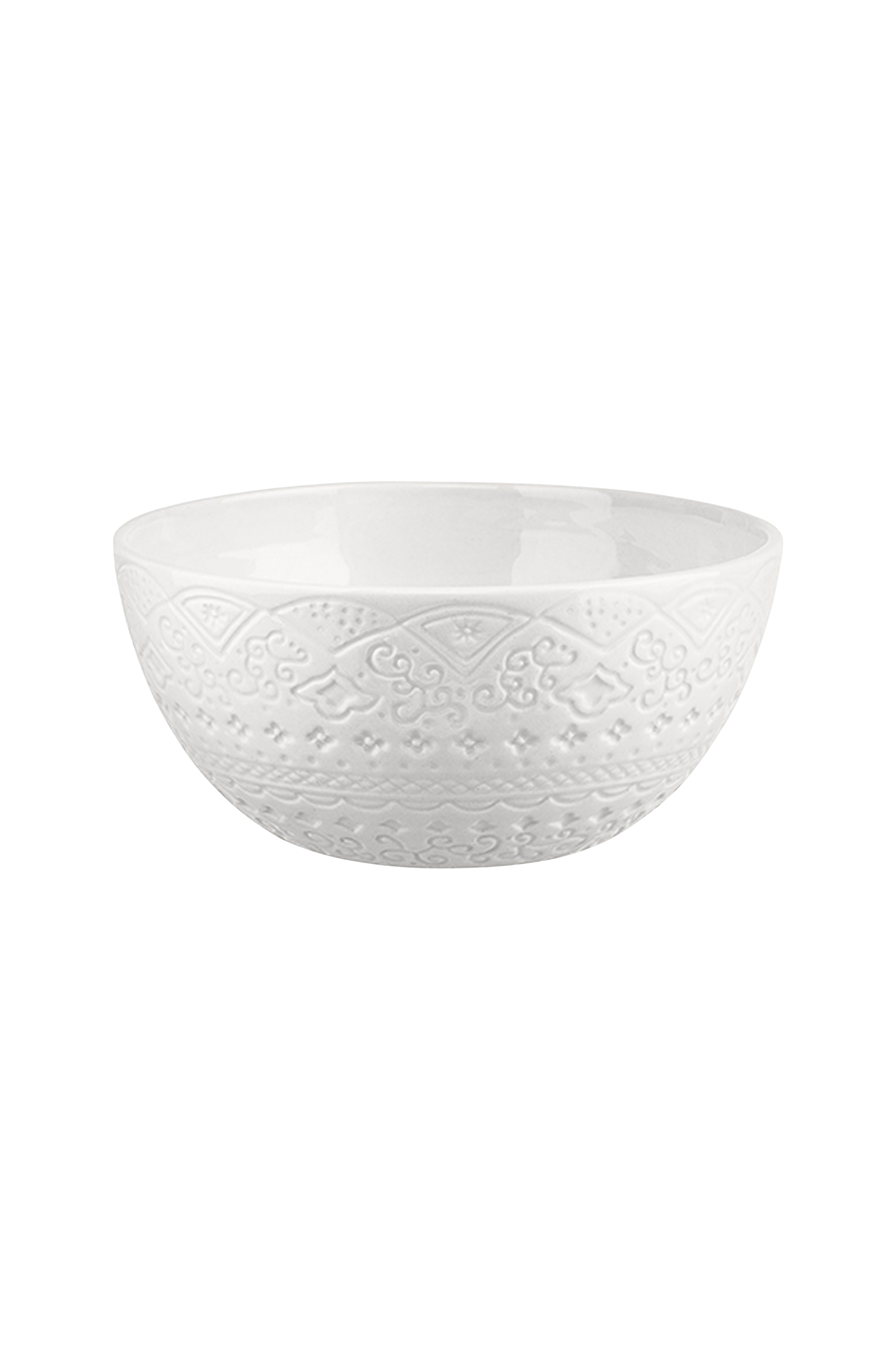 Kestävästä kivitavarasta valmistettu aamiaiskulho, jossa kaunis reliefikuvio ulkopinnalla ja sileä sisäpinta. Kestää mikroaaltouunin, uunin ja astianpesukoneen. Suunnittelija Marita Lord.