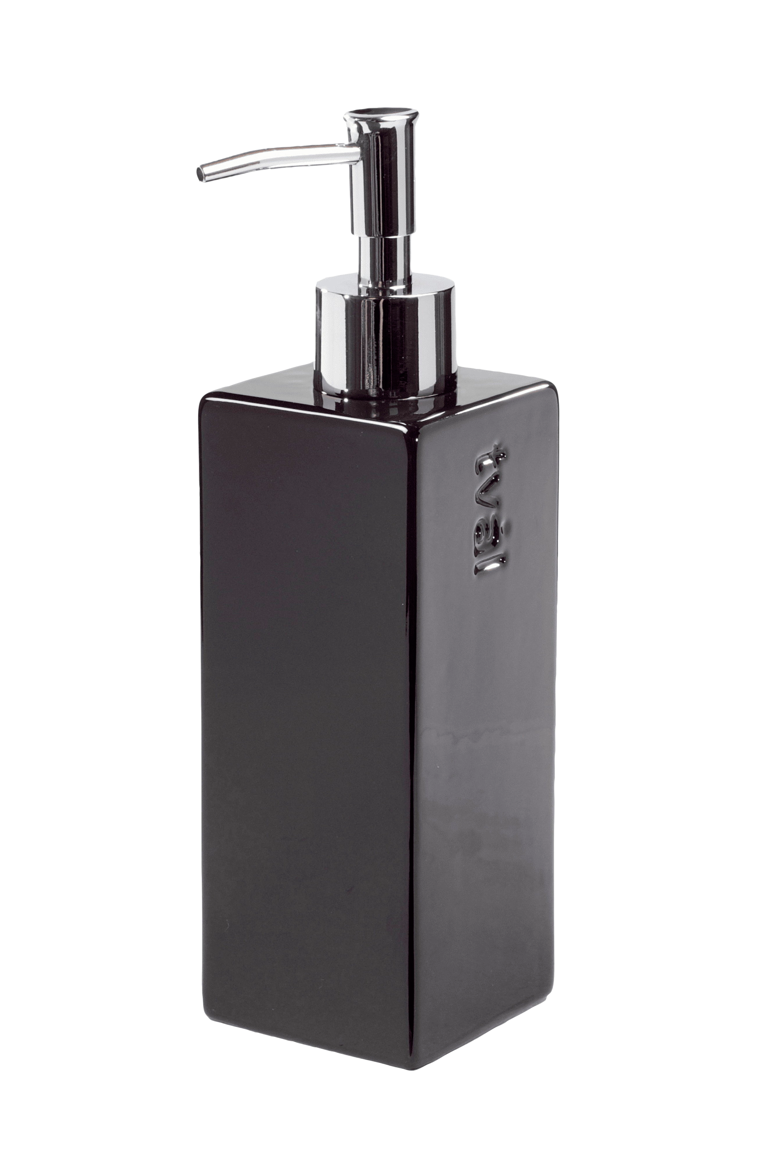 Keraaminen saippuapumppu, jossa on kohokuvioitu teksti. Tämän tyylikkään ja käytännöllisen esineen on suunnitellut Marita Lord .