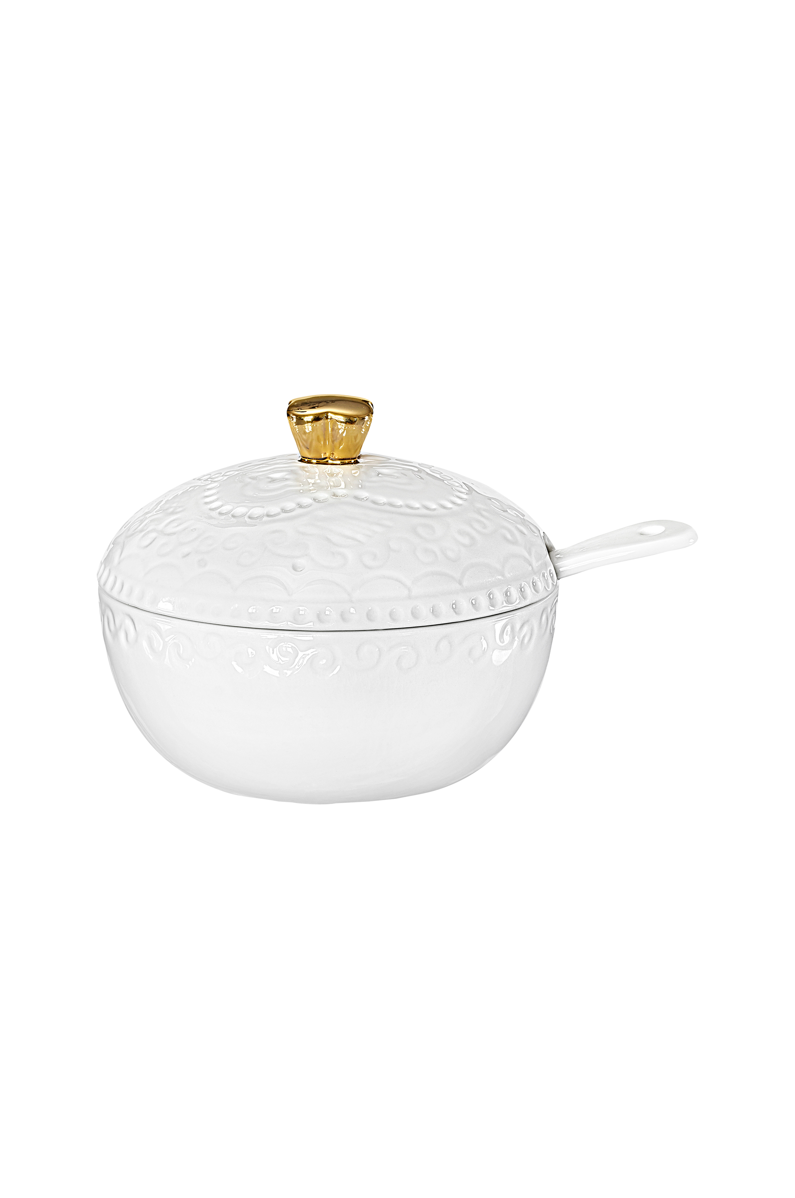 Suolakulho, jossa kansi ja lusikka. Lasitettua kivitavaraa. Orient-astiaston kaunis kuvio on ammattitaitoisten käsityöläisten käsin tekemä. Tämän tekniikan ansiosta lasitteissa voi esiintyä pieniä sävyeroja eri tuotteiden välillä.