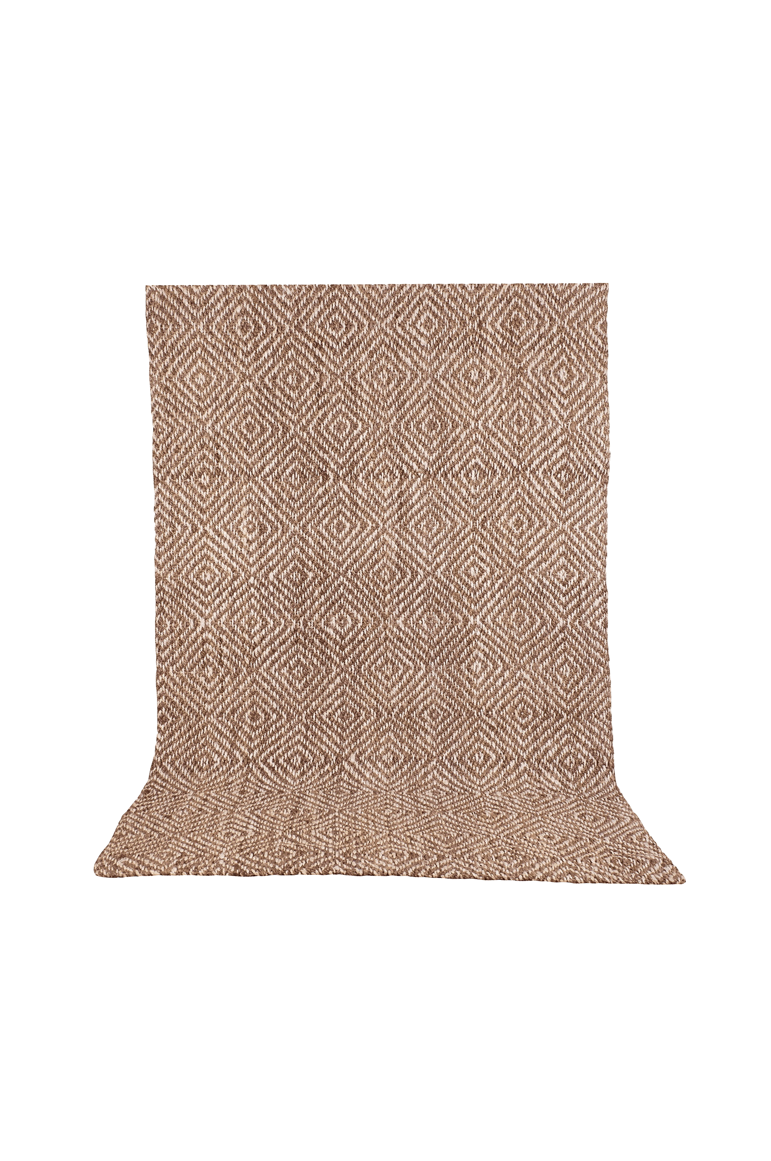 Käsinkudottu juuttimatto, jossa isokuvioinen hanhensilmäkuvio.