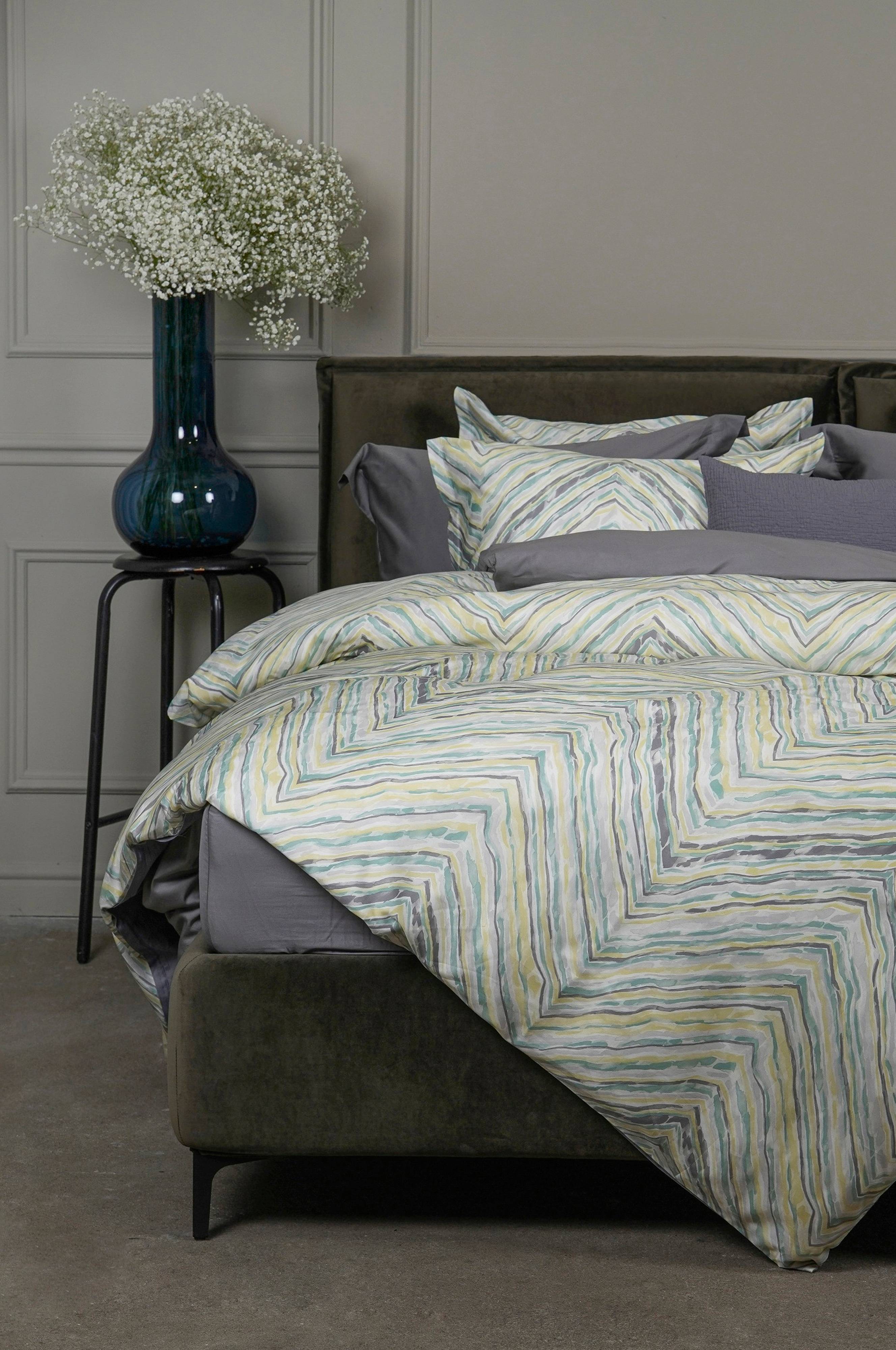 Dunes-malliston pussilakanasetti. Pussilakanasetissä on taiteellinen, käsinmaalatun näköinen akvarellikuvio. Aaltomainen kuvio luo modernin vaikutelman ja kutsuu sinut rentoutumaan. Pitkäkuituista puuvillasatiinia, jonka langantiheys on 300 TC. Materiaali on kestävää ja tuntuu miellyttävältä nukkuessa.