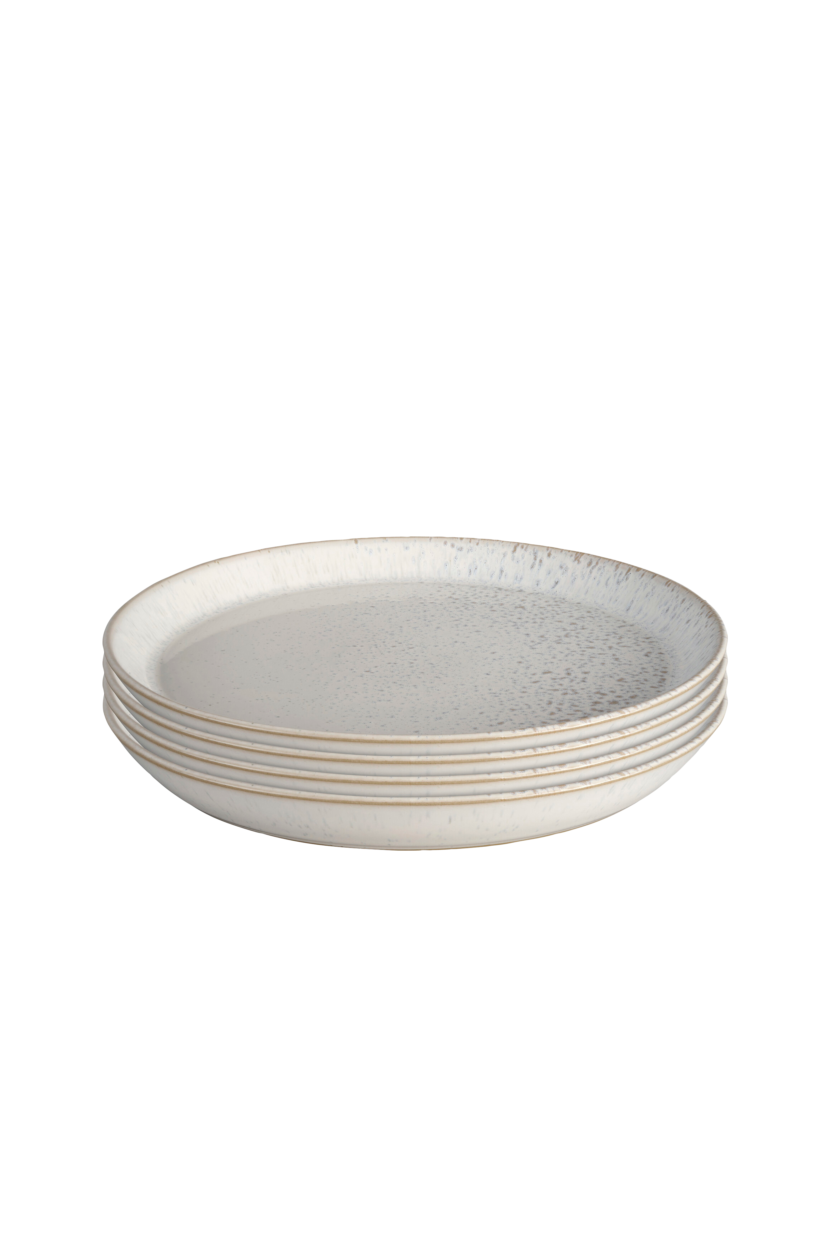 Denbyn Kiln-sarjan lautaset, 4/pakkaus. Sarjan tuotteissa yhdistyvät pehmeät valkoisen, harmaan ja beigen sävyt sekä klassinen englantilainen käsityö, ja mutkattoman muotoilunsa ansiosta sarjan tuotteet on helppo yhdistää muihin astioihin ja ne korostavat kauniisti tarjoiltavaa ruokaa. Ainutlaatuinen pilkullinen lasite antaa kaikille tuotteille yksilöllisen kuvioinnin ja ilmeen. Voidaan käyttää uunissa, mikroaaltouunissa, astianpesukoneessa ja pakastimessa.