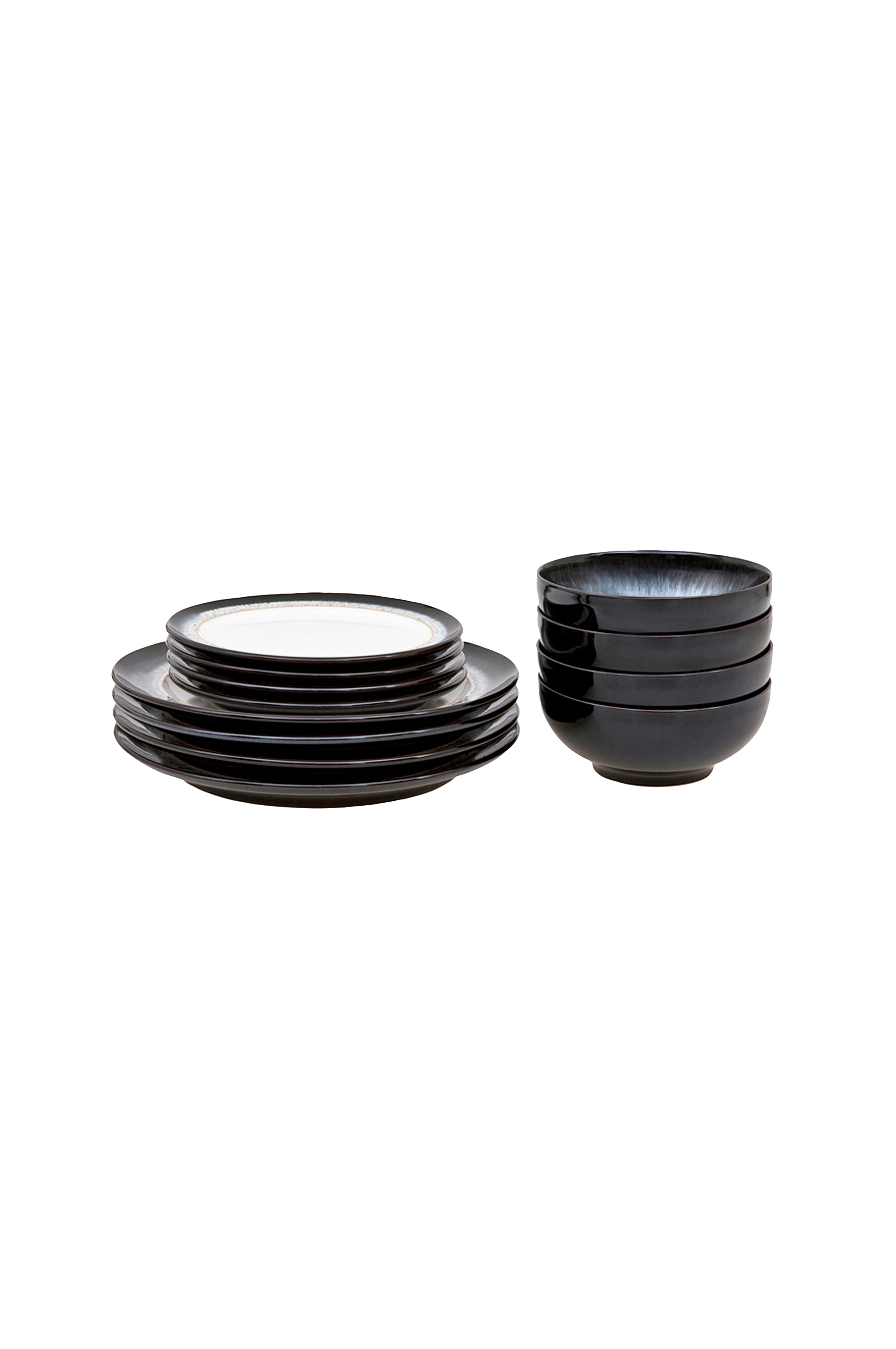 Denbyn Halo-sarjan 12-osainen lautassarja. Kivitavaraa, jossa näyttävä lasite. Tämän vaikuttavan ilmeen luomiseen on käytetty kahta lasitetta.