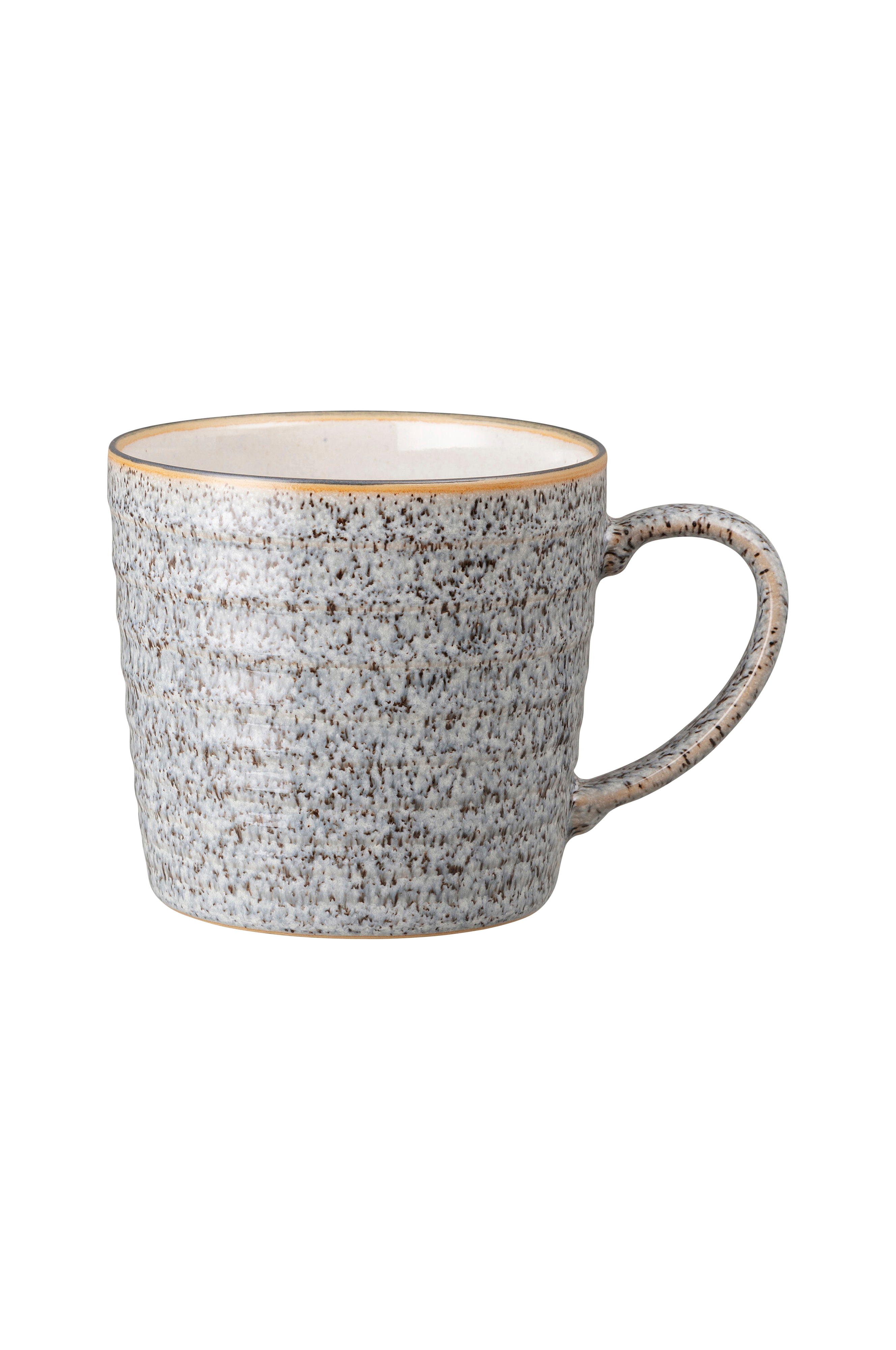 Käsintehty, uurrettu Denby-kivitavaramuki laadukkaasta ja paikallisesti tuotetusta savesta. Hillityt sävyt ja harmaa reaktiivinen lasite, jota kehystää syvä ja täyteläinen hiilinauha. Muki kultaa aamiaishetken joka päivä.