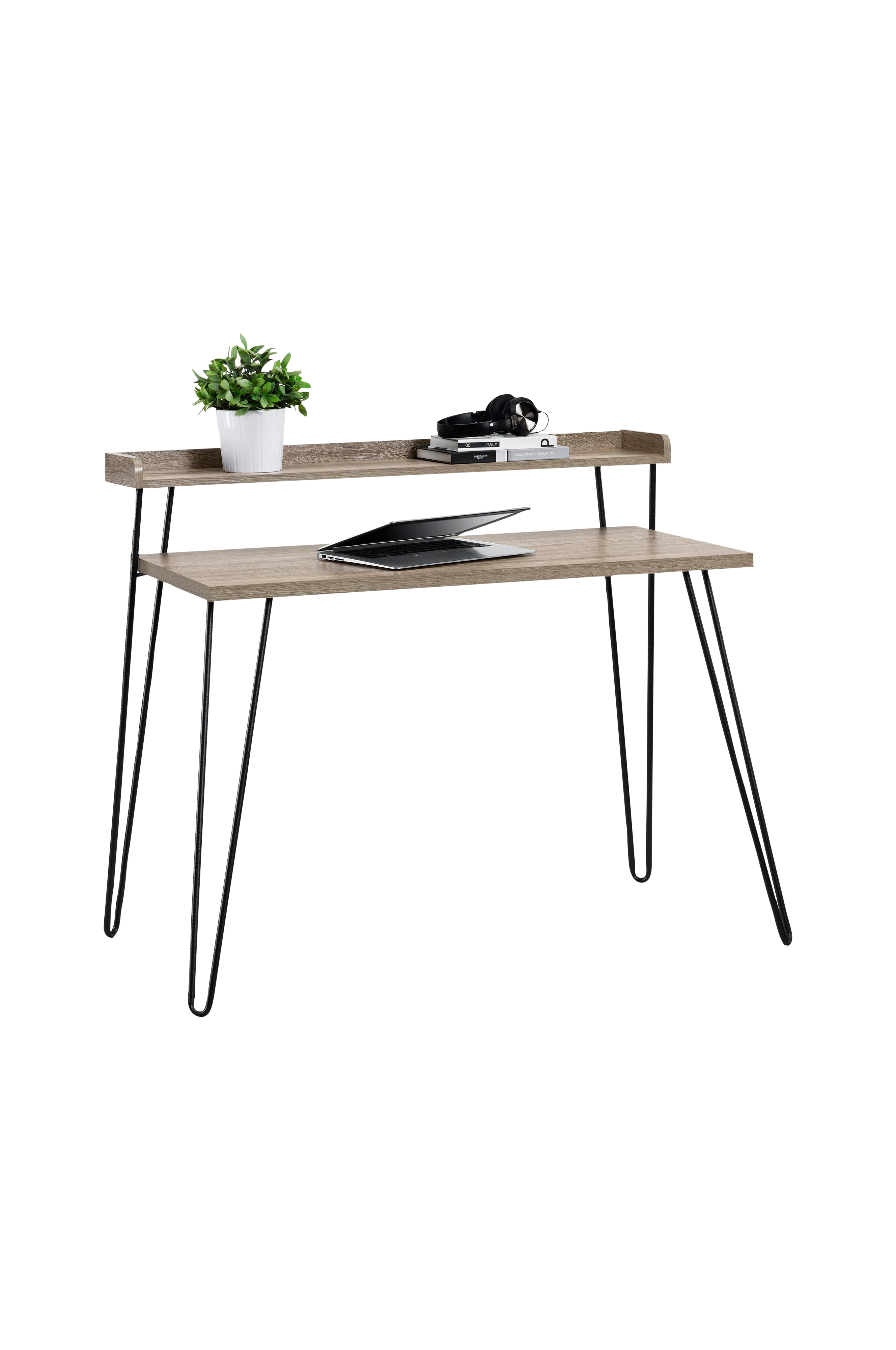 Haven Retro Desk -kirjoituspöydässä yhdistyvät teollishenkinen ja moderni tyyli. Kompaktissa pöydässä on kaksi tasoa ja se sopii erinomaisesti pienehköihin huoneisiin. Tämän kirjoituspöydän avulla luot itsellesi toimivan työpisteen kotiin. Työtaso on riittävän suuri kannettavalle tietokoneelle, muistikirjoille ja toimistotarvikkeille, ja ylähyllyä voi käyttää kätevänä laskutasona. Kapeat metallijalat antavat pöydälle miellyttävää retrohenkeä. Kirjoituspöytä toimitetaan litteässä paketissa, ja se on erittäin helppo koota. Suosittelemme, että kaksi aikuista kokoaa tuotteen.