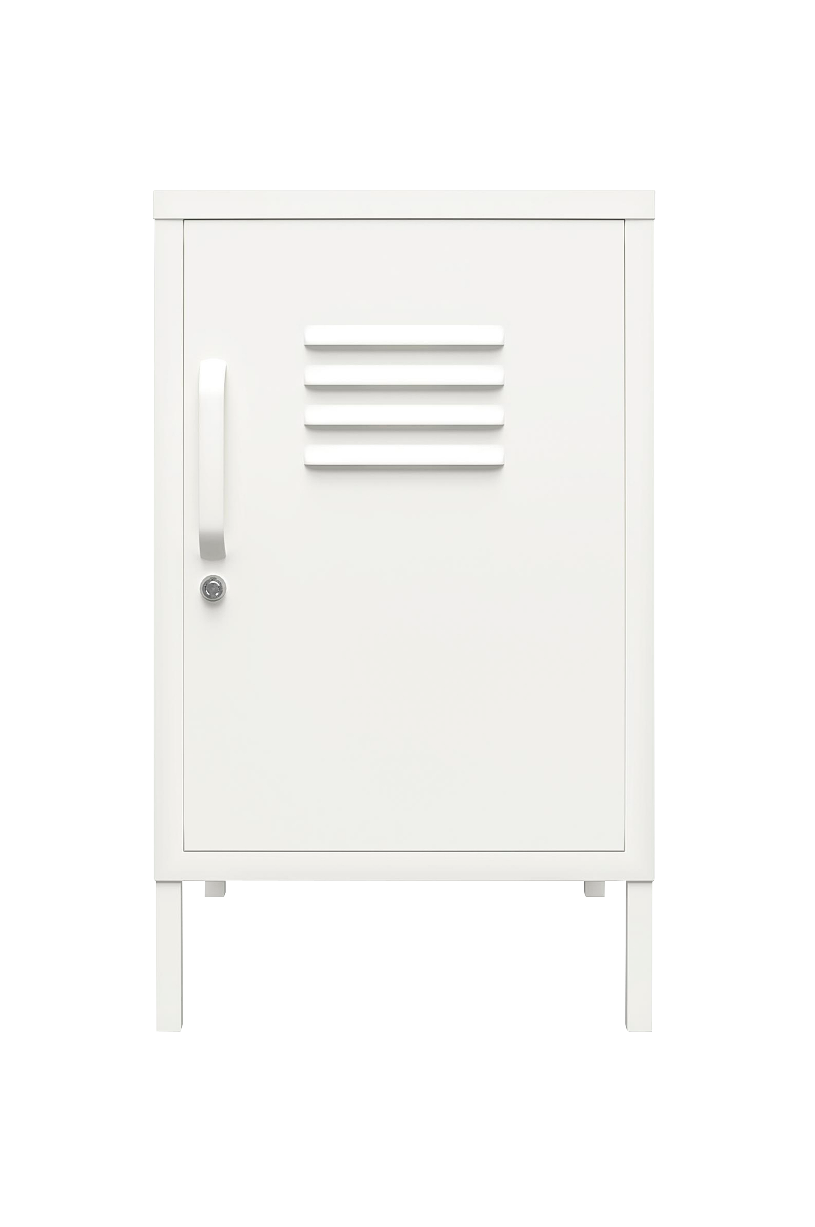Systembuild Evolution Mission District Metal Locker End Table on hauska sivupöytä. Pöytä on valkoista jauhemaalattua metallia, ja sen muotoilu tuo mieleen koulun pukuhuoneen. Hauska sisustuselementti olohuoneessa. Metalli on helppo puhdistaa kostealla liinalla. Kaapin sisällä olevat kaksi hyllyä ovat täydelliset kirjojen, lehtien ja elektroniikan säilyttämiseen. Ovessa on lukko, joka pitää tavarasi turvassa. Mukana kiinnityssarja kalusteen seinään kiinnittämistä varten. Sivupöytä toimitetaan osina litteässä pakkauksessa. Suosittelemme, että kaksi aikuista kokoaa tuotteen. Kootun sivupöydän mitat K 69 x L 38 x S 40 cm.