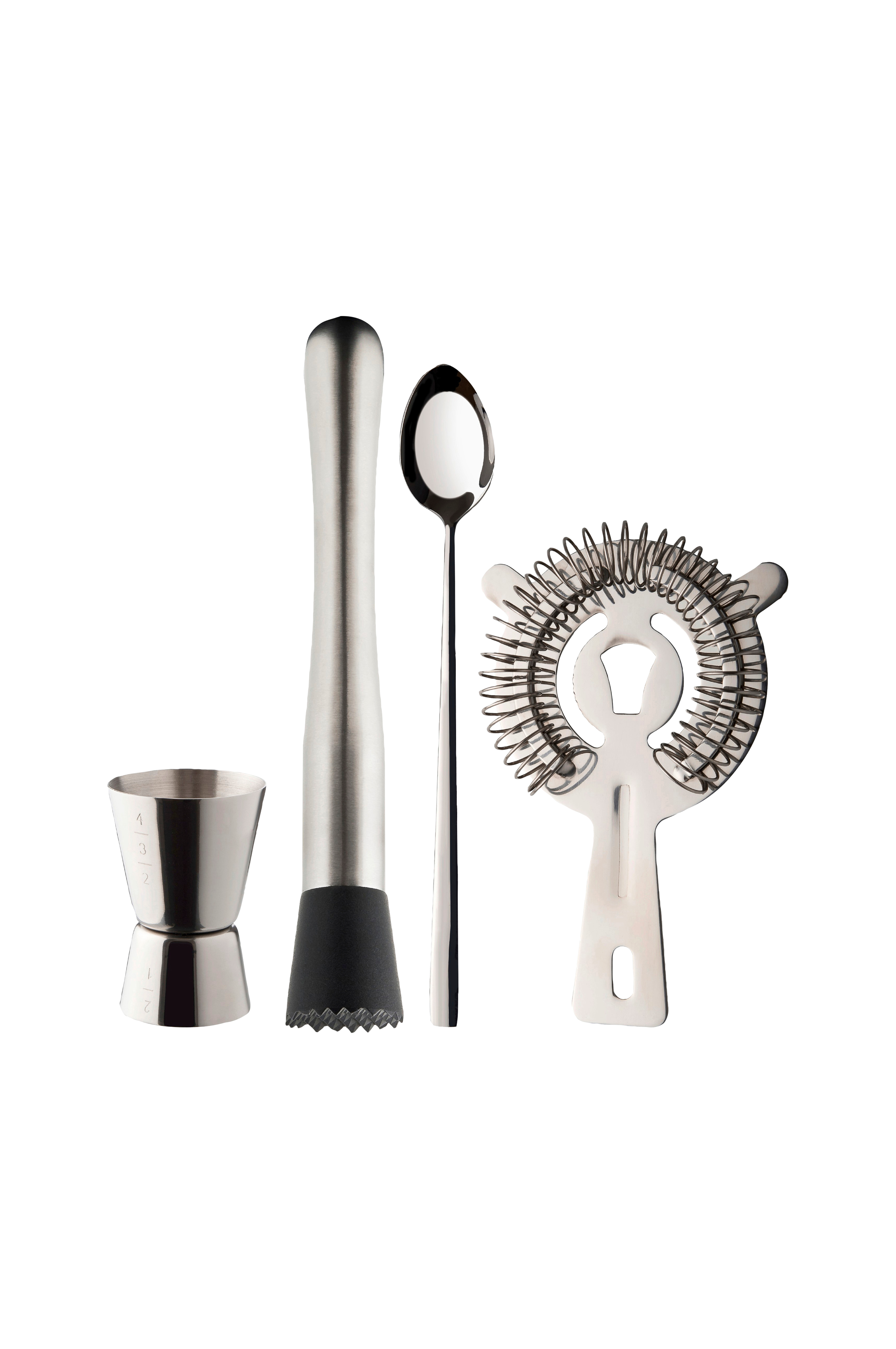 Dillon-baarisetti ruostumatonta terästä. Cocktailsiivilä, cocktailmurskain, cocktaillusikka, baarimitta 2-4 cl.