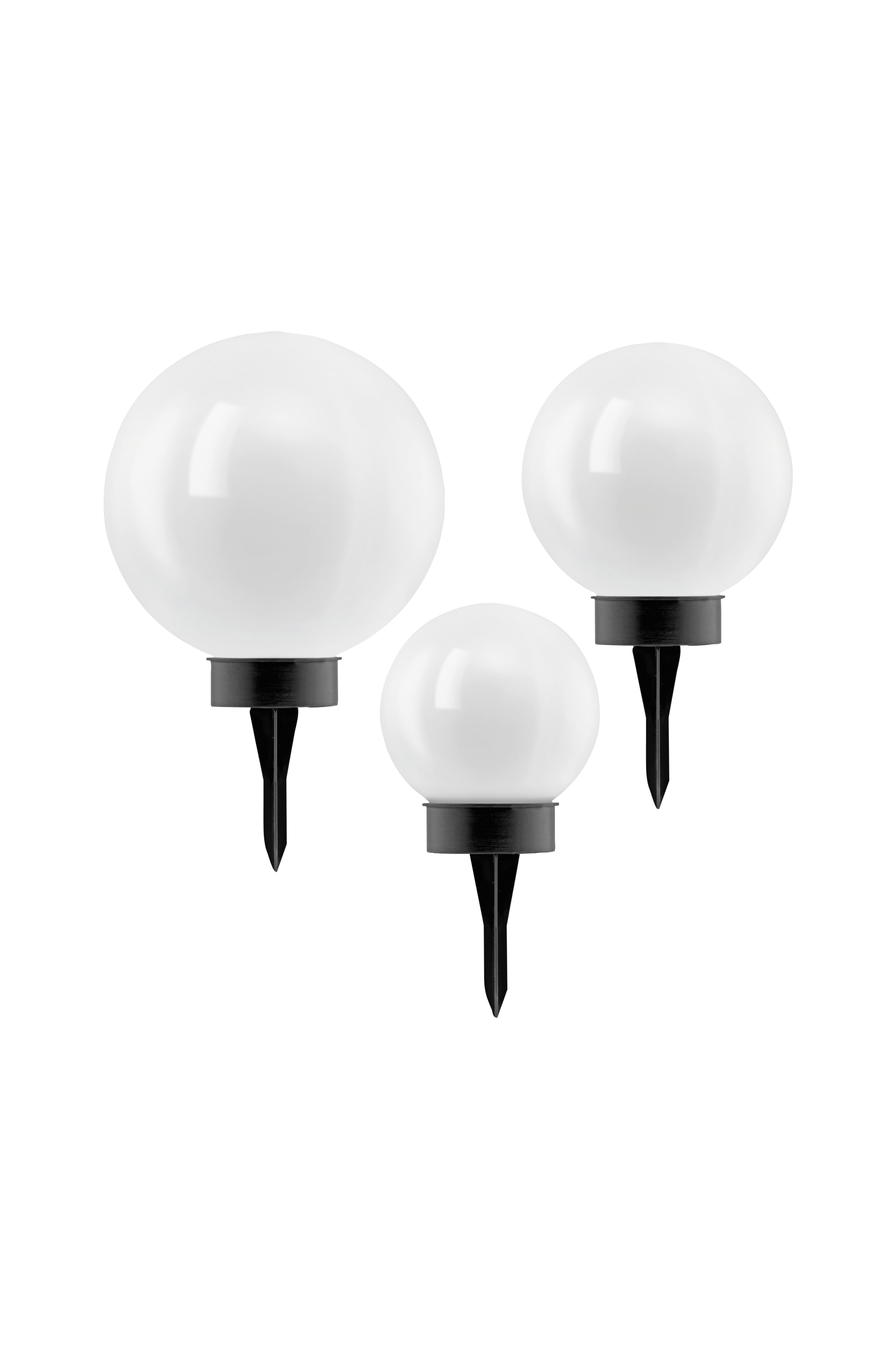 Tuote on kolmen ulkokäyttöön tarkoitetun aurinko-led-maapiikin sarja, jossa on pallomaiset valkoiset valodiffuusorit ja mustat pohjat. Modernin muotoilun ja integroitujen aurinkopaneelien ansiosta nämä led-ulkovalaisimet tarjoavat energiatehokkaan valaistusratkaisun, joka kirkastaa minkä tahansa ulkotilan ja tuottaa valoa, joka kestää 6-8 tuntia, kun se on ladattu auringon avulla. Led-komponenttien ansiosta tuote tuottaa lämpimän valkoista valoa. Tuote sopii erinomaisesti puutarhapolkujen ja ajoteiden valaisemiseen sen ip44-luokituksen ansiosta.