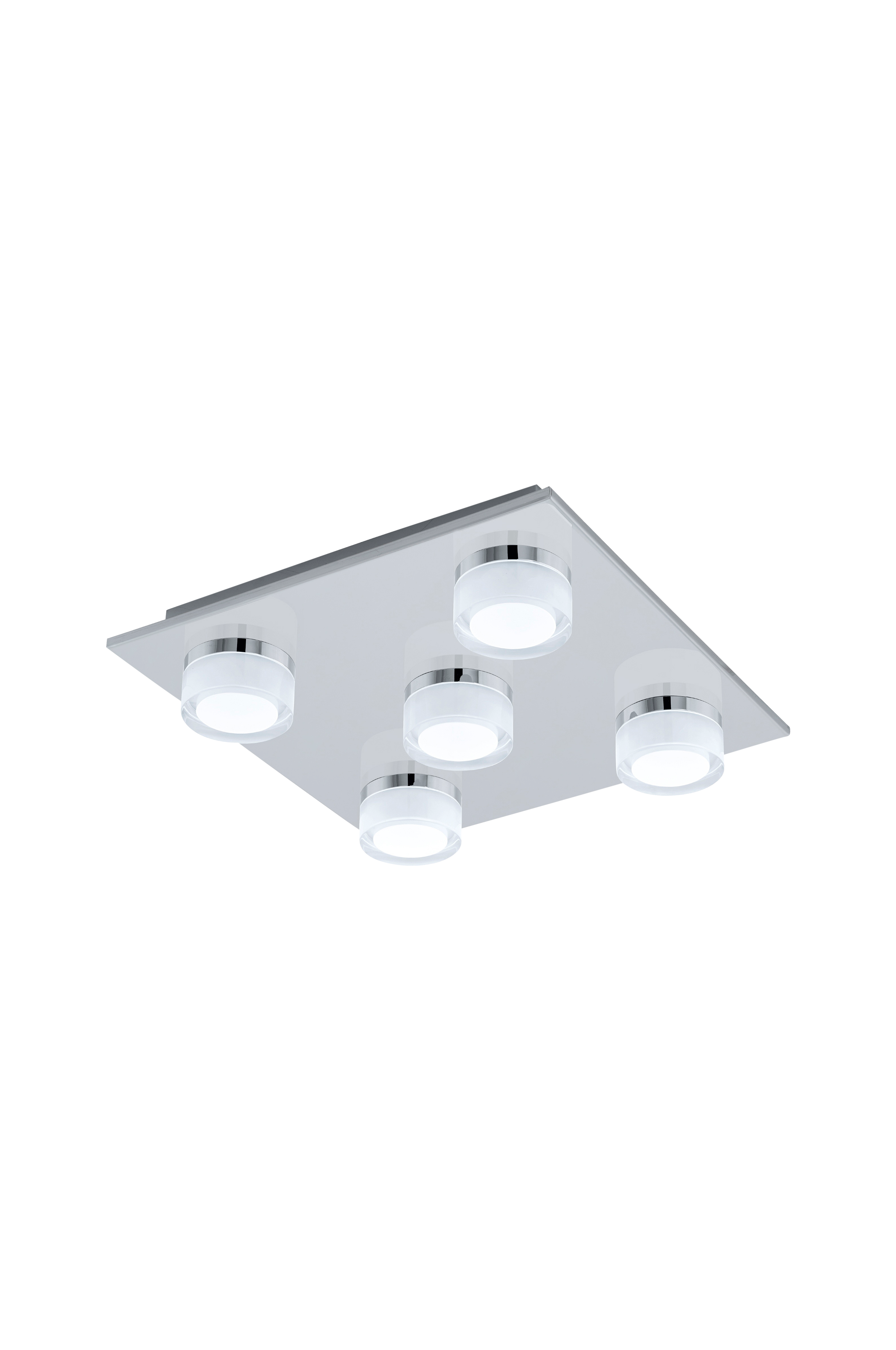 romendo 1 led-kattovalaisimessa on neliskulmainen krominvärinen metallirunko, jossa on viisi pyöreää kirkkaasta ja satiinimuovista valmistettua valoelementtiä. Kirkkaiden valopaneelien takana olevat integroidut ledit tuottavat miellyttävää lämpimän valkoista valoa, ja ne ovat himmennettävissä seinällä olevalla koordinoivalla kiertohimmenninlaitteella. Tuote soveltuu käytettäväksi kylpyhuoneessa, koska se on suojattu roiskevedeltä ip44-suojauksella. Klassisen muotoilunsa ansiosta kattovalaisin sopii erilaisiin sisustustyyleihin ja tarjoaa valaistuksen, joka toimii hyvin kylpyhuoneessa.