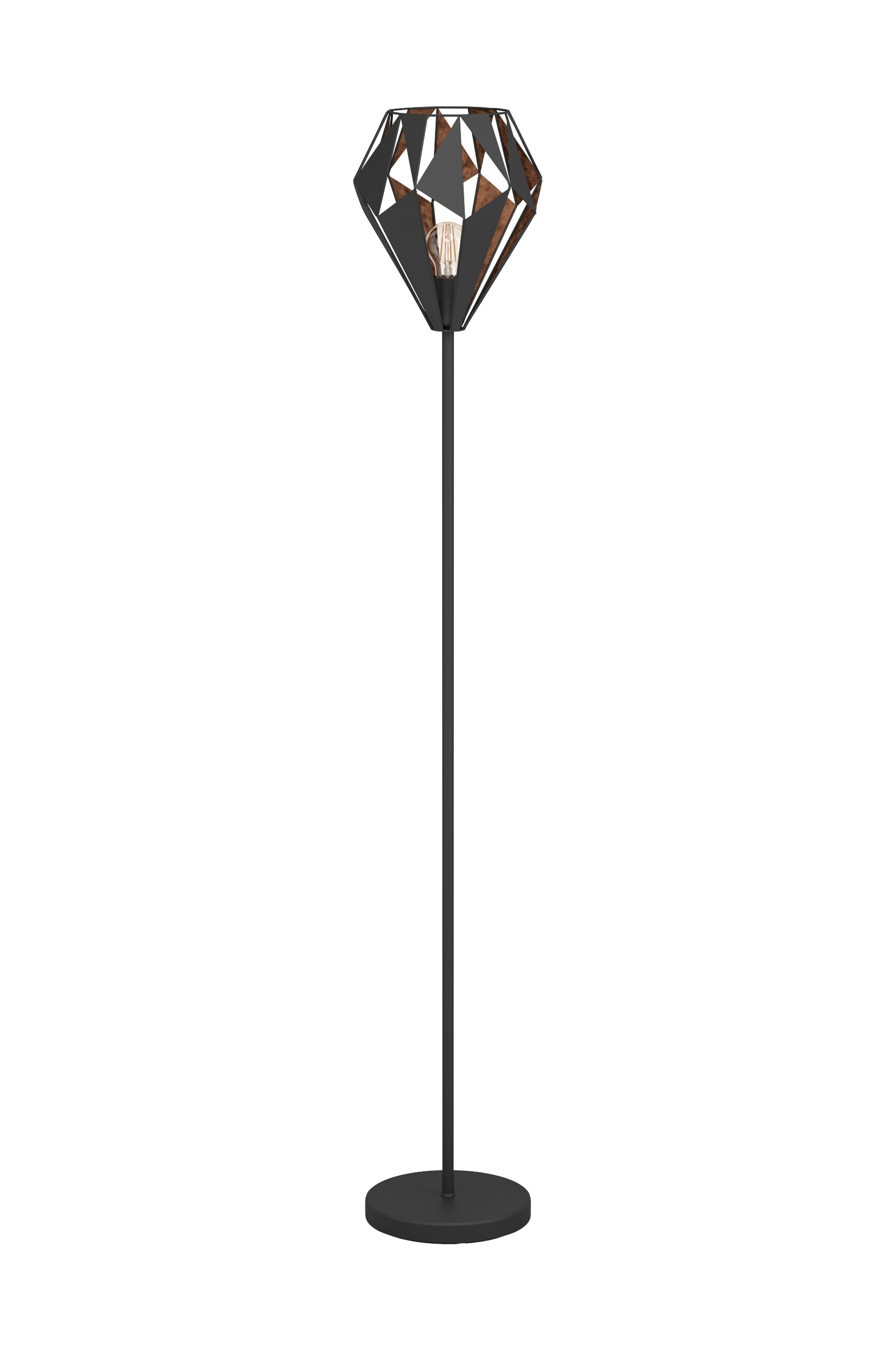 carlton 1 -lattiavalaisimessa on lineaarinen musta langallinen jalusta ja timantinmuotoinen musta metallinen lampunvarjostin. Varjostimessa on kuparivuori. Valaisin voidaan kytkeä päälle ja pois päältä helposti lattiakytkimellä. Lattiavalaisin tuo kauniin viimeistelyn moderniin sisustukseen ja luo viihtyisän valaistuksen olohuoneeseen, makuuhuoneeseen tai eteiseen. Tuotteeseen tarvitaan 1 e27-lamppu, joka ei sisälly toimitukseen.