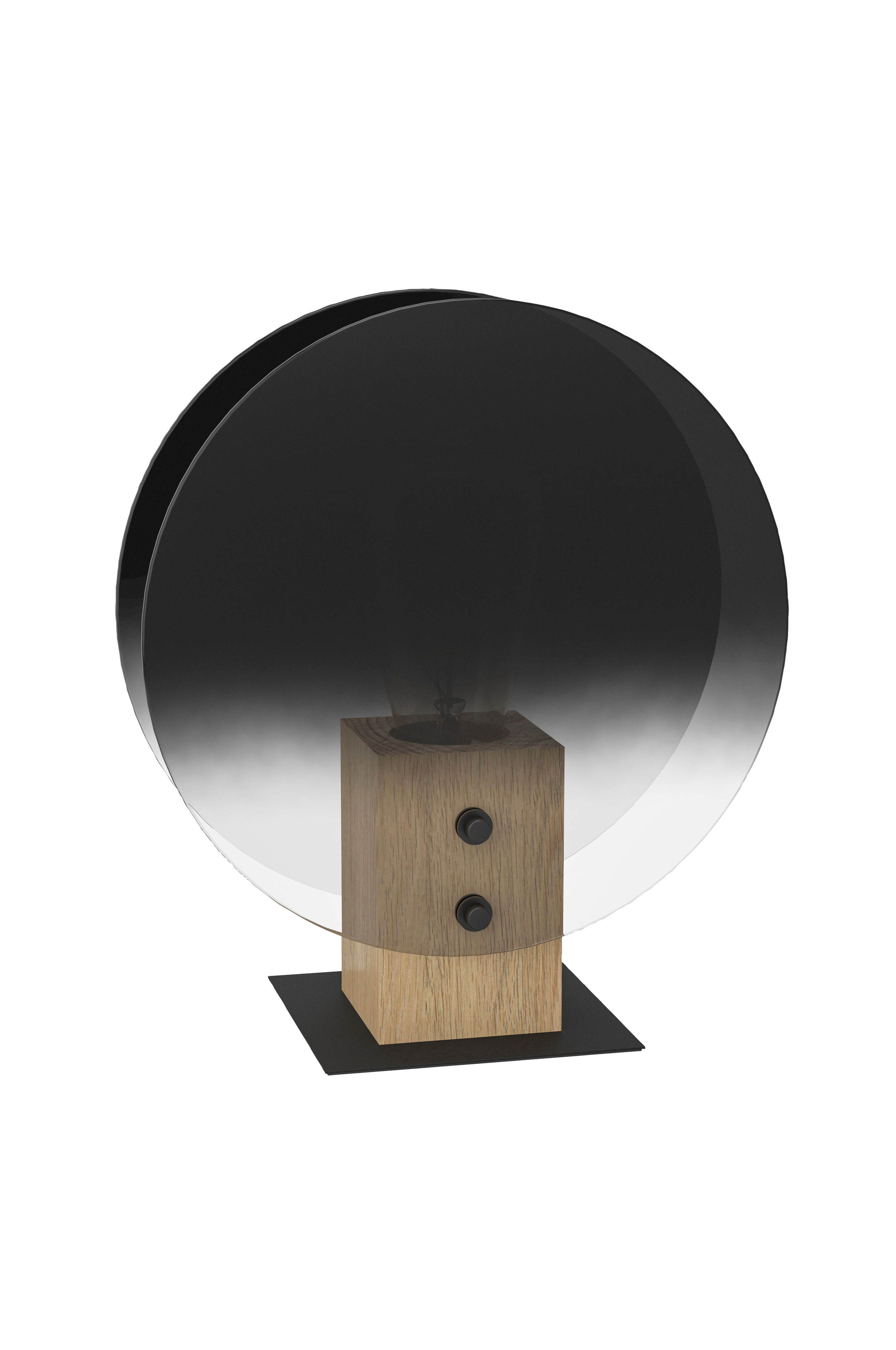 Pöytävalaisimessa millena on kumipuujalusta ja musta teräslevy. Näihin on yhdistetty musta metallinen lampunpidin, joka on sijoitettu kahden lasin väliin, joissa on mustasta harmaaseen ja läpinäkyvään vaihteleva värisävy. Valaisin voidaan kytkeä päälle ja pois päältä helposti rivikytkimen avulla. Pöytävalaisin täydentää modernia sisustusta ja tarjoaa houkuttelevan valaistusratkaisun mihin tahansa tilaan, olipa kyseessä sitten olohuone, makuuhuone, eteinen tai ruokasali. Tuotteessa on e27-lamppukannatin ja se vaatii 1 x e27-lamppua, joka ei sisälly toimitukseen.