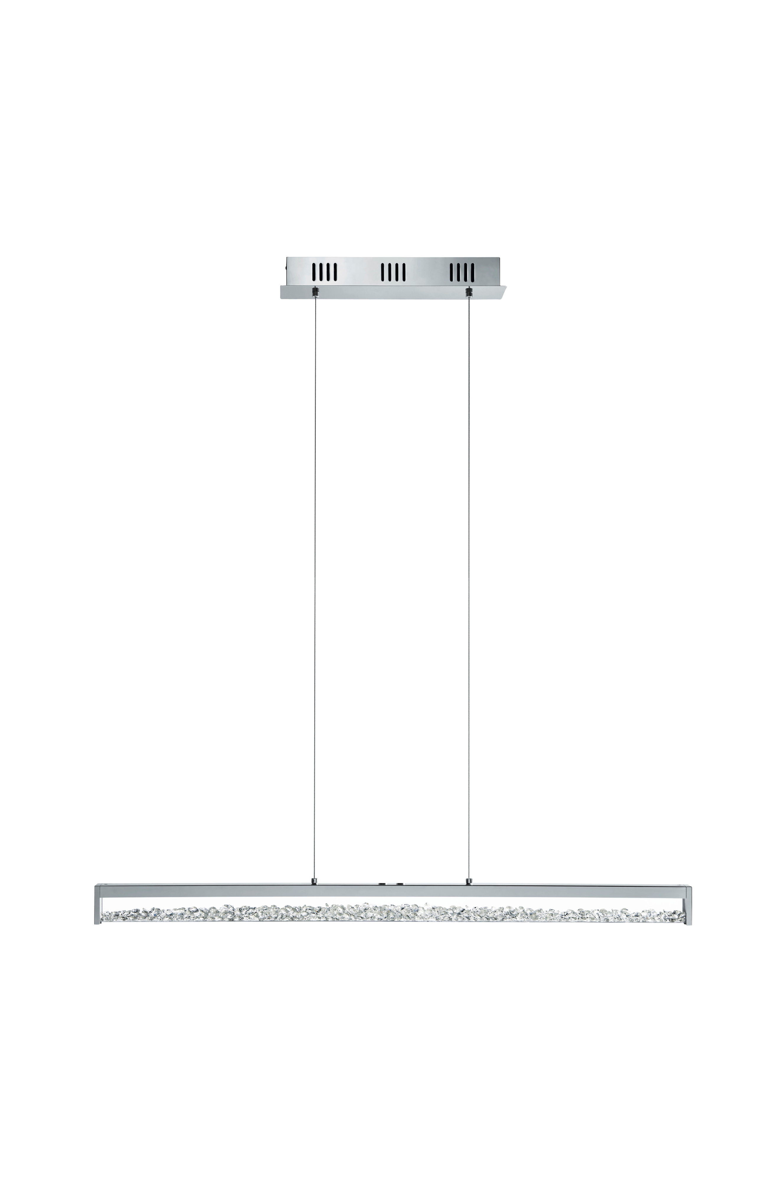 cardito 1 led-riippuvalaisin on valmistettu kromatusta tai mustasta teräksestä ja alumiinista, ja siinä on pitkänomainen lasirunko, jonka sisällä on kimaltelevia kiteitä. Kirkkaat lasikristallit luovat kimaltelevan ja laadukkaan ilmeen heti valon syttyessä, ja integroidut ledit tuottavat miellyttävää valoa, jota voidaan säätää tarpeen mukaan. Voit valita lämpimän valkoisen, neutraalin valkoisen ja kylmän valkoisen valon välillä. "Touch me" -alueella voit kytkeä riippuvalaisimen päälle ja pois päältä sekä säätää värilämpötilaa. Riippuvalaisimen pituus on 100 cm, ja se on varmasti erottuva, tyylikäs ja huomiota herättävä elementti kodissasi, ja se sopii täydellisesti ripustettuna pitkän ruokapöydän yläpuolelle.