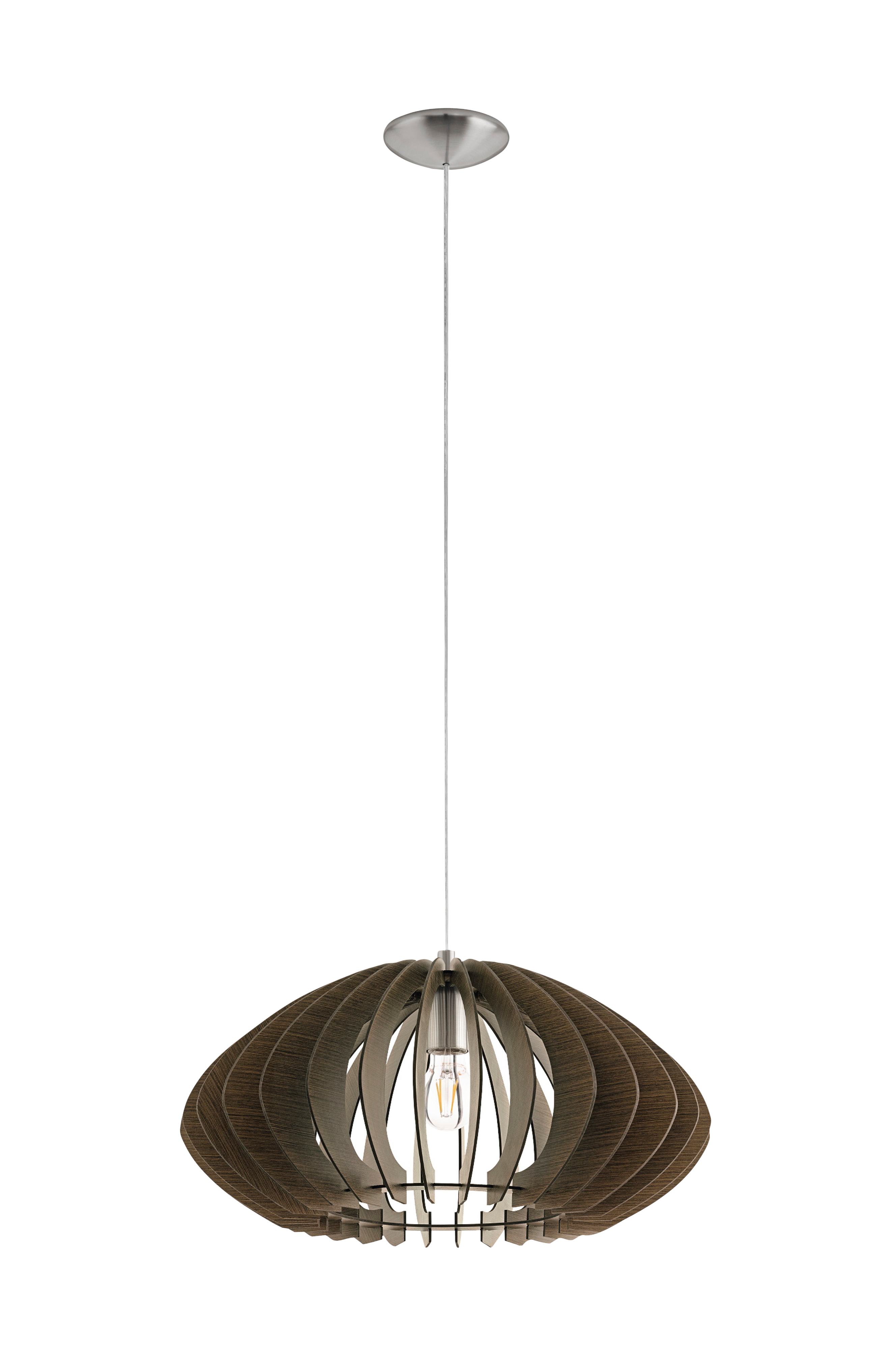cossano 2 -riippuvalaisimessa on pyöreä lampunvarjostin, joka on valmistettu vaahteranvärisistä tai ruskeista puulamelleista, jotka ripustetaan matta nikkelin väriseen metallikatokseen. Puiset säleet luovat kiehtovan valon ja varjon leikin, kun valo on päällä. Riippuvalaisimen halkaisija on 50 cm, ja se sopii saumattomasti moderniin sisustustyyliin ja antaa viihtyisän valaistuksen olohuoneeseen tai ruokapöydän yläpuolelle ruokasalissa. Kuvassa oleva hehkulamppu ei sisälly toimitukseen. Tuotteessa on e27-lamppupidike ja se vaatii e27-lamppua.