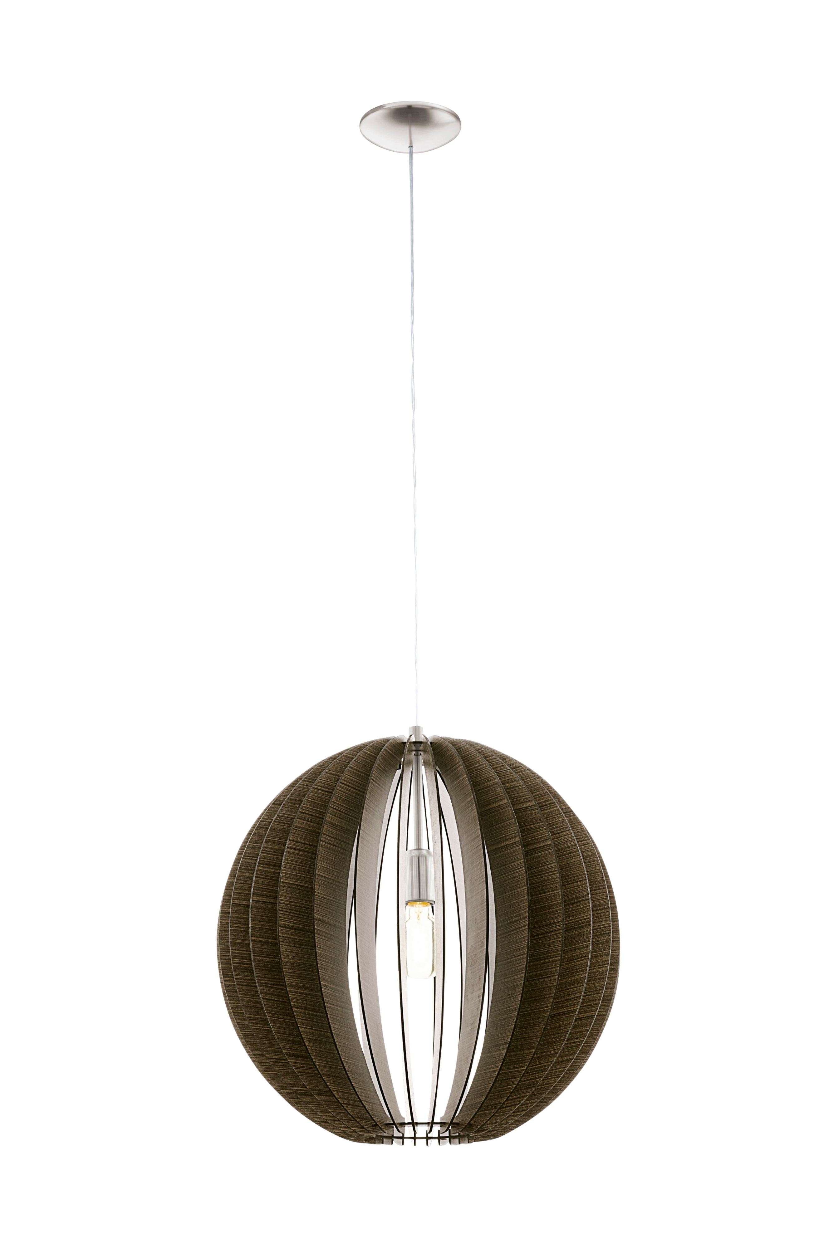 Riippuvalaisimessa cossano on ruskeista puuviiluista valmistettu pyöreä lampunvarjostin, joka on ripustettu matta nikkelin väriseen metallikatokseen. Puiset säleet luovat kiehtovan valon ja varjon leikin, kun valo on päällä. Riippuvalaisimen halkaisija on 50 cm, ja se sopii saumattomasti moderniin sisustustyyliin ja antaa viihtyisän valaistuksen olohuoneeseen tai ruokapöydän yläpuolelle. Lamppu ei sisälly toimitukseen. Tuotteessa on e27-lamppukannatin ja se vaatii 1 e27-lamppua.