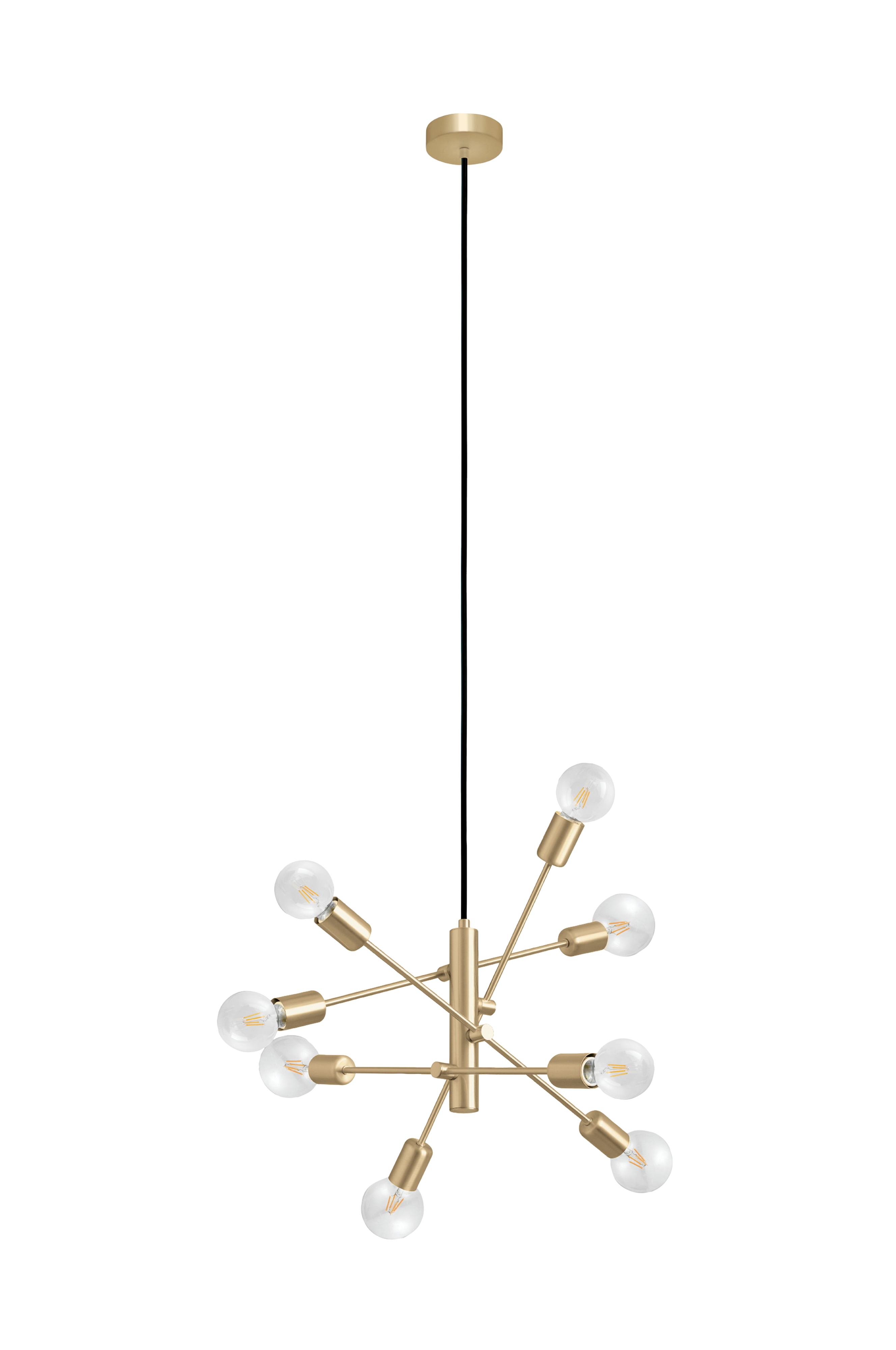 gradoli 1 -riippuvalaisimessa on teräsrakenne, jossa on harjattua messinkiä. Offset-linjaiset varret ovat säädettävissä, jotta voit luoda yksilöllisen valaisimen, joka täydentää tyyliäsi. Riippuvalaisimessa on tähtimäinen muotoilu, kahdeksan näkyvää lampun pistorasiaa ja musta tekstiilikaapeli, ja se sopii tyylikkäisiin ja futuristisiin sisätiloihin. Riippuvalaisin sulautuu saumattomasti moderniin sisustukseen ja luo keskipisteen mihin tahansa tilaan, olipa kyseessä sitten olohuone tai ruokapöydän yläpuolella oleva valaisin. Tuote vaatii 8 x e27-lamppua, jotka eivät sisälly toimitukseen.