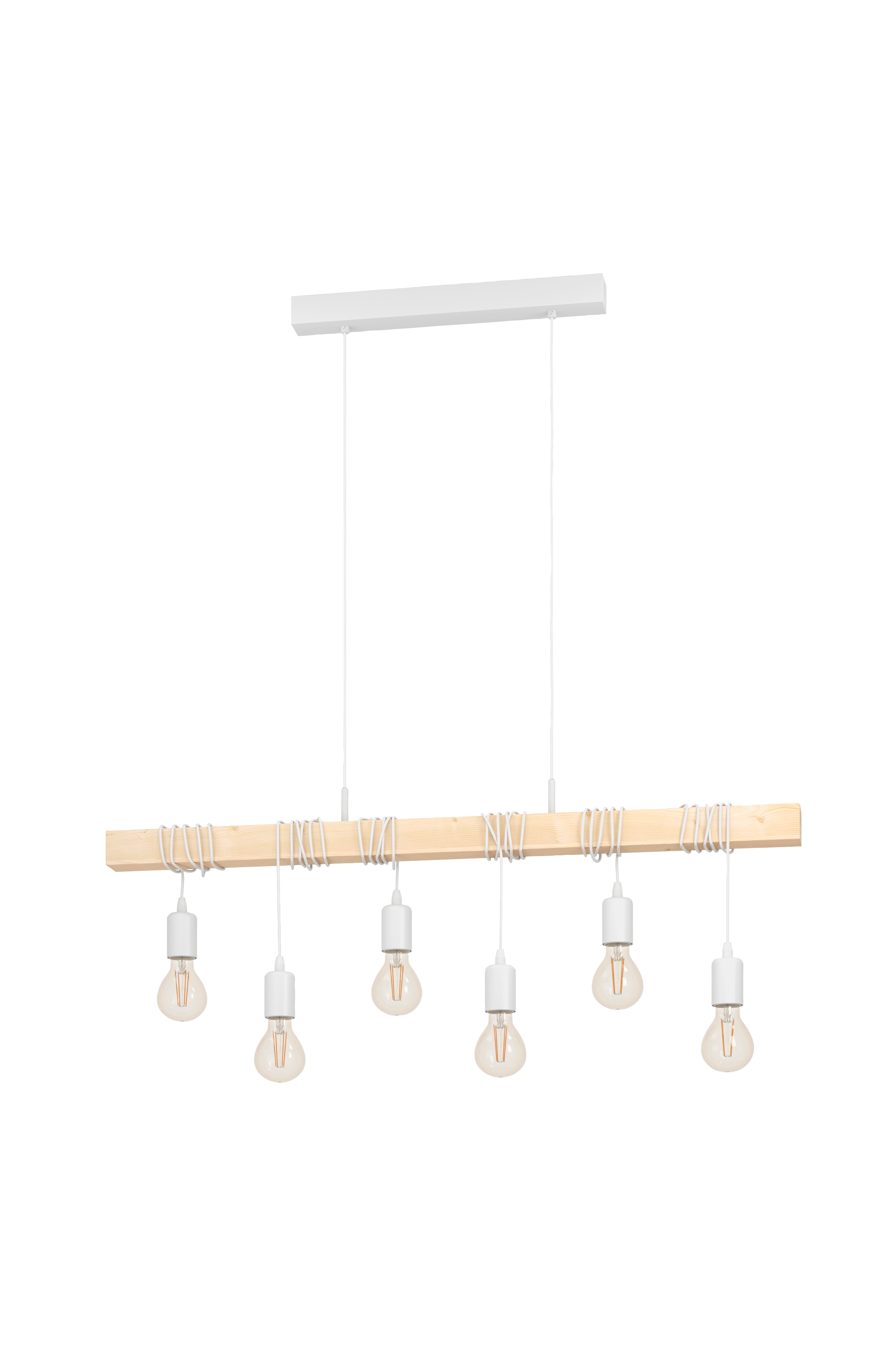 Riippuvalaisimessa townshend on puinen palkki ja kuusi valkoista lampunpidintä. Lampunpitimet on ripustettu eri korkeuksille, ja niitä voidaan vaihtaa kelaamalla tai purkamalla kaapelit. Mäntypuun ja metallin silmiinpistävä yhdistelmä sopii saumattomasti moderniin sisustukseen, kuten scandi- ja vintage-tyyliin. Muotoilu tarjoaa erottuvan valaistuksen mihin tahansa tilaan, olipa kyseessä sitten olohuone tai ruokasalin pitkän pöydän yläpuolella oleva valaisin. Kuvissa olevat maitomaisen valkoiset lamput eivät sisälly toimitukseen. Tuotteessa on e27-lamppukannattimet ja se vaatii e27-lamppuja.