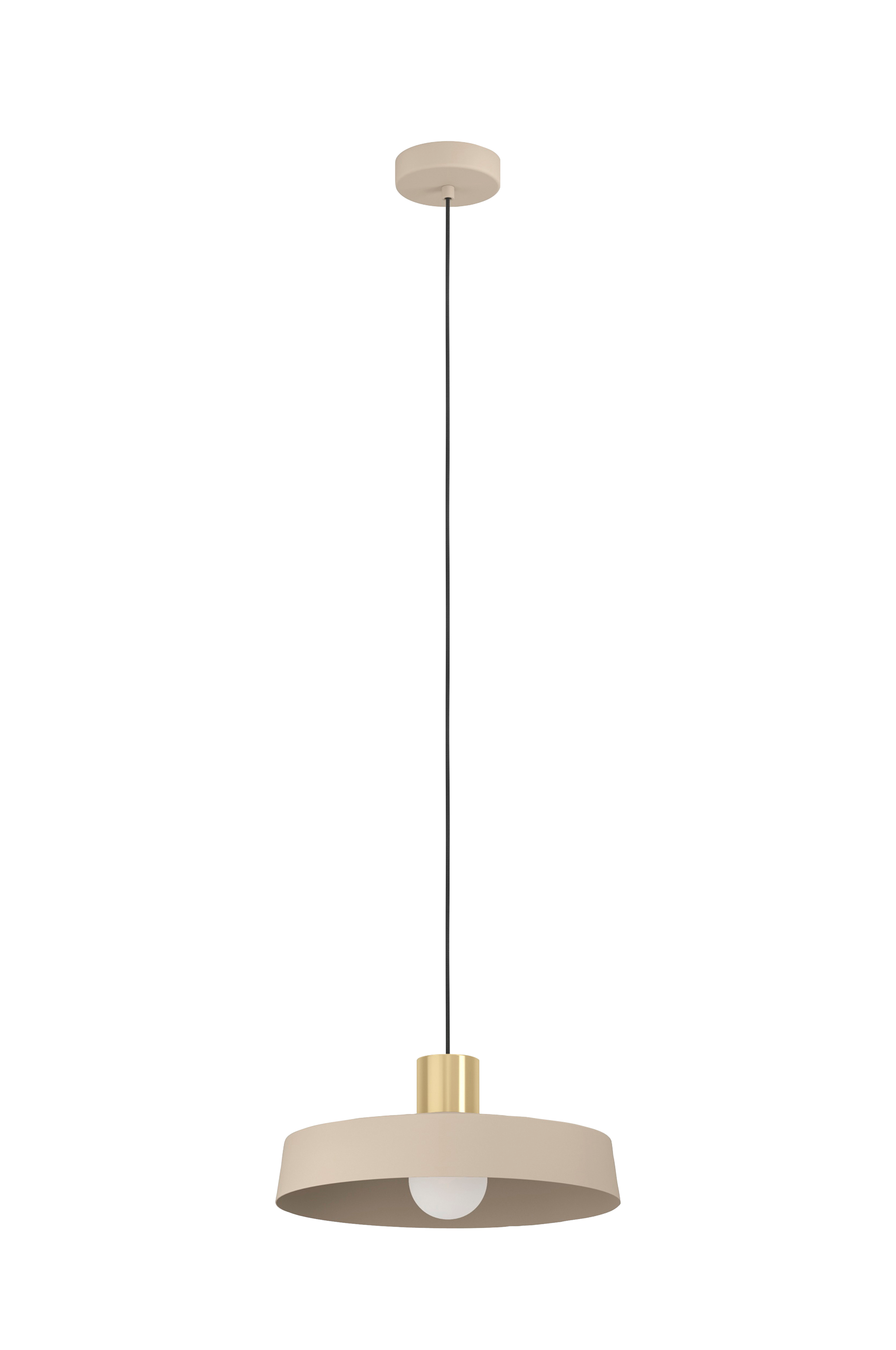 Riippuvalaisimessa valdiola on pyöreä teräksinen lampunvarjostin hiekanvärisellä viimeistelyllä, jonka päällä on harjattua messinkiä oleva teräksinen aksentti. Koristeellinen aksentti yhdessä vaalean varjostimen kanssa antaa valaisimelle tyylikkään ilmeen. Varjostin on ripustettu mustalla tekstiilikaapelilla hiekanvärisestä metallikatoksesta. Riippuvalaisin antaa tyylikkään valaistuksen olohuoneeseen tai ruokapöydän yläpuolelle. Tuotteessa on e27-lamppukannatin ja se vaatii 1 x e27-lamppua, joka ei sisälly toimitukseen.