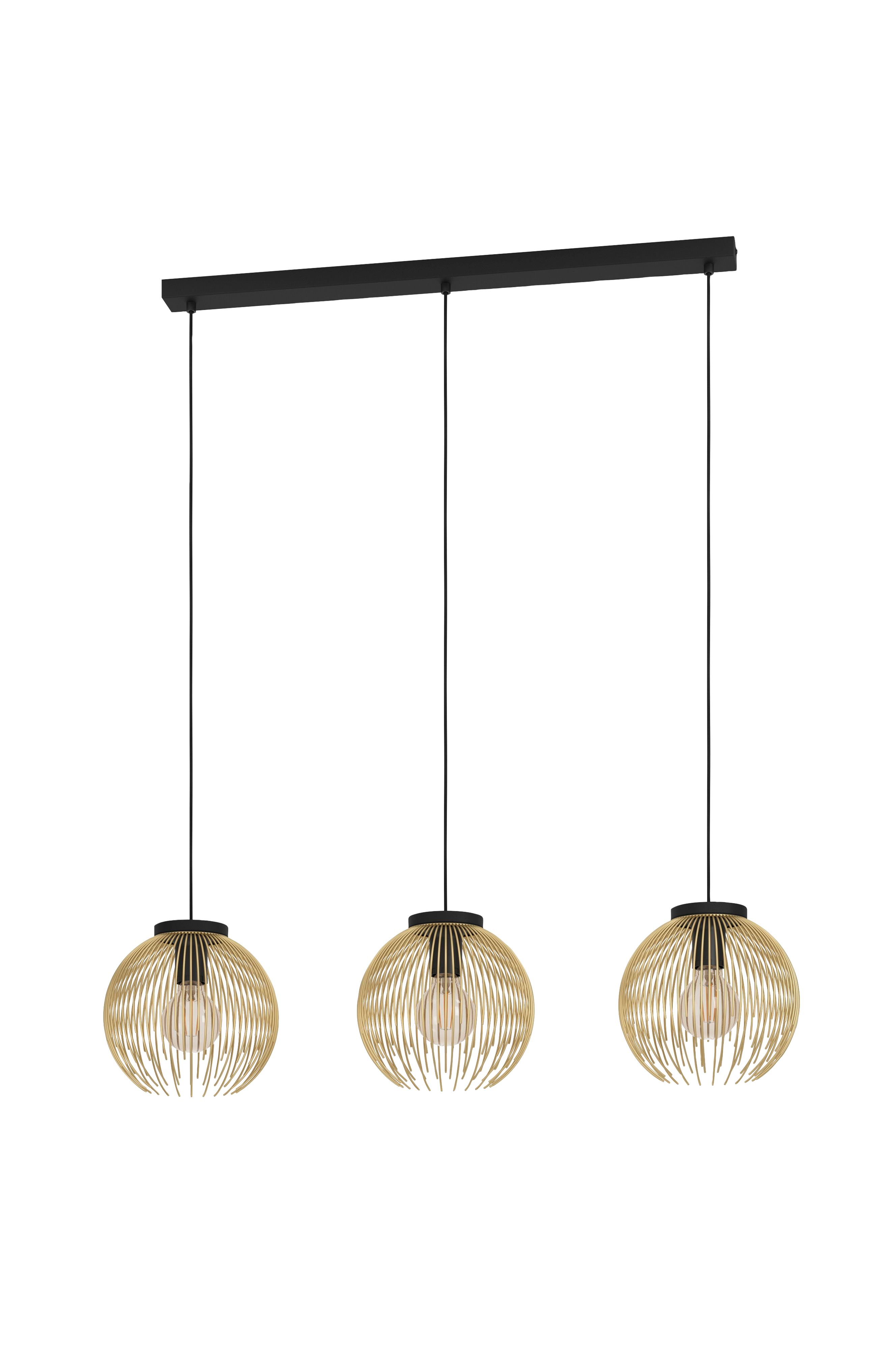 venezuela -riippuvalaisimessa on kolme kullanväristä vaijerilamppua, jotka riippuvat pitkästä mustasta metallikatoksesta mustalla tekstiilikaapelilla. Kukin vaijerilampunvarjostin kaartuu harmonisesti lampun ympärille, mikä luo valon ja varjon kiehtovan leikin, kun se on valaistu. Riippuvalaisin täydentää modernia sisustusta ja tarjoaa tyylikästä valaistusta olohuoneeseen tai ruokapöydän yläpuolelle. Kuvissa olevat hehkulamput eivät sisälly, ja tuotteeseen tarvitaan 3 x e27-lamppua.