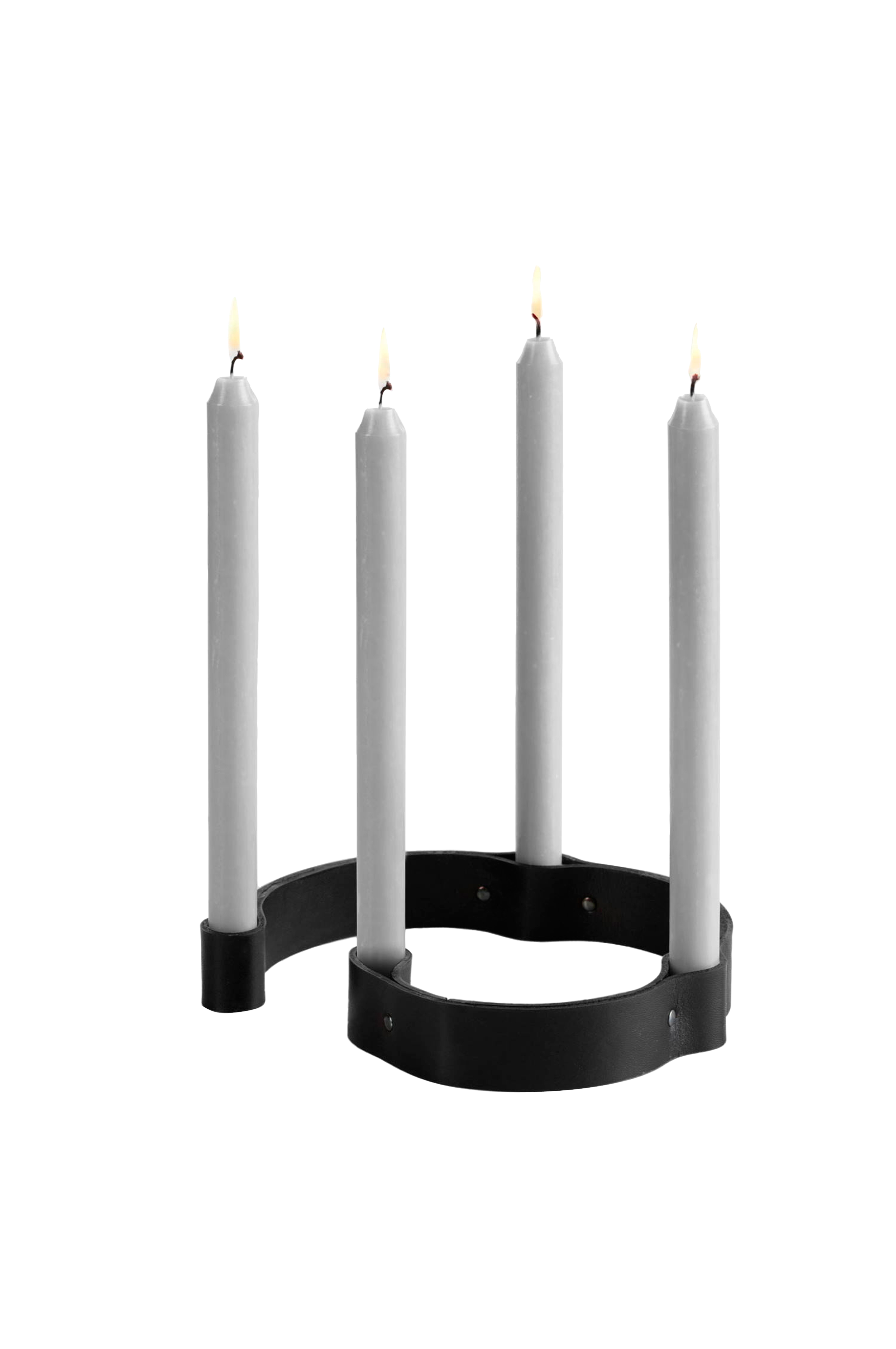 Belt 4 Candles on moderni nahkainen kynttilänjalka, jossa on pelkistetty muotoilu. Siinä on paikka neljälle kynttilälle, joten se sopii täydellisesti adventtikyntteliköksi. Mitat: pituus 63 cm, korkeus 3,5 cm. Materiaali: selkänahkaa.