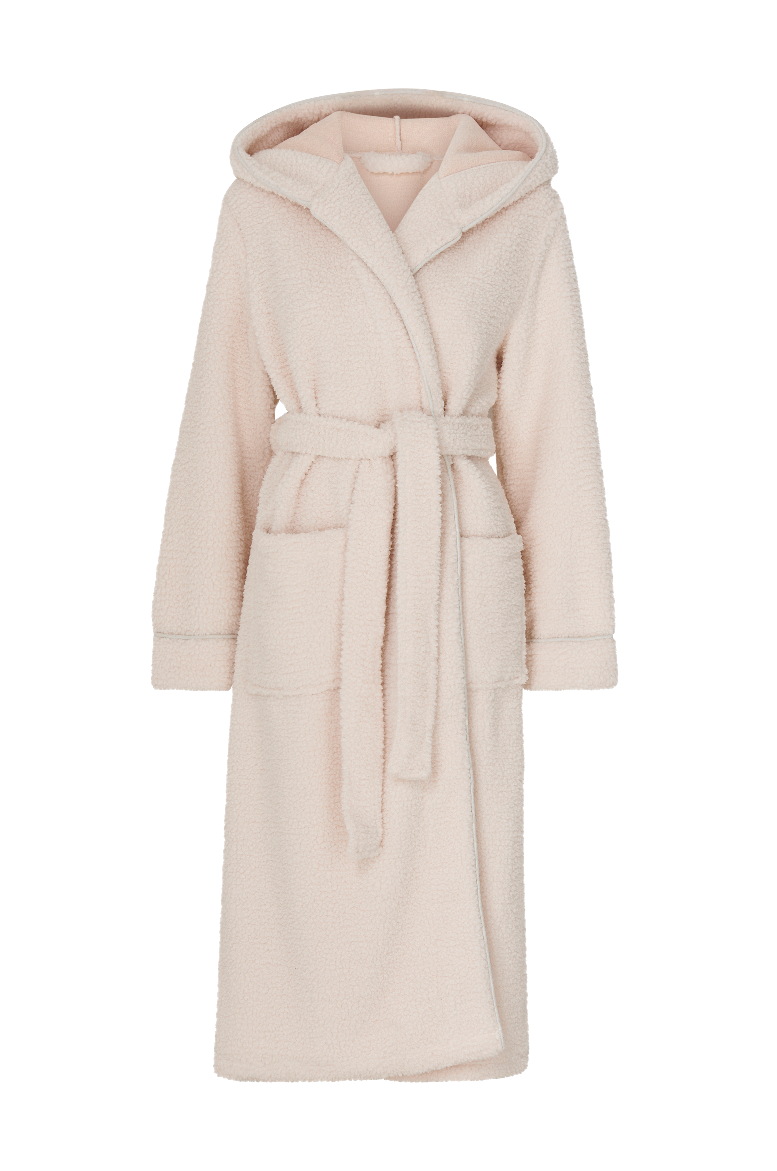 Aamutakki pehmeää teddyä. Sileä sisäpinta. Huppu ja kaksi taskua. Solmimisnauhat edessä ja irrotettava solmimisvyö vyötäröllä.
