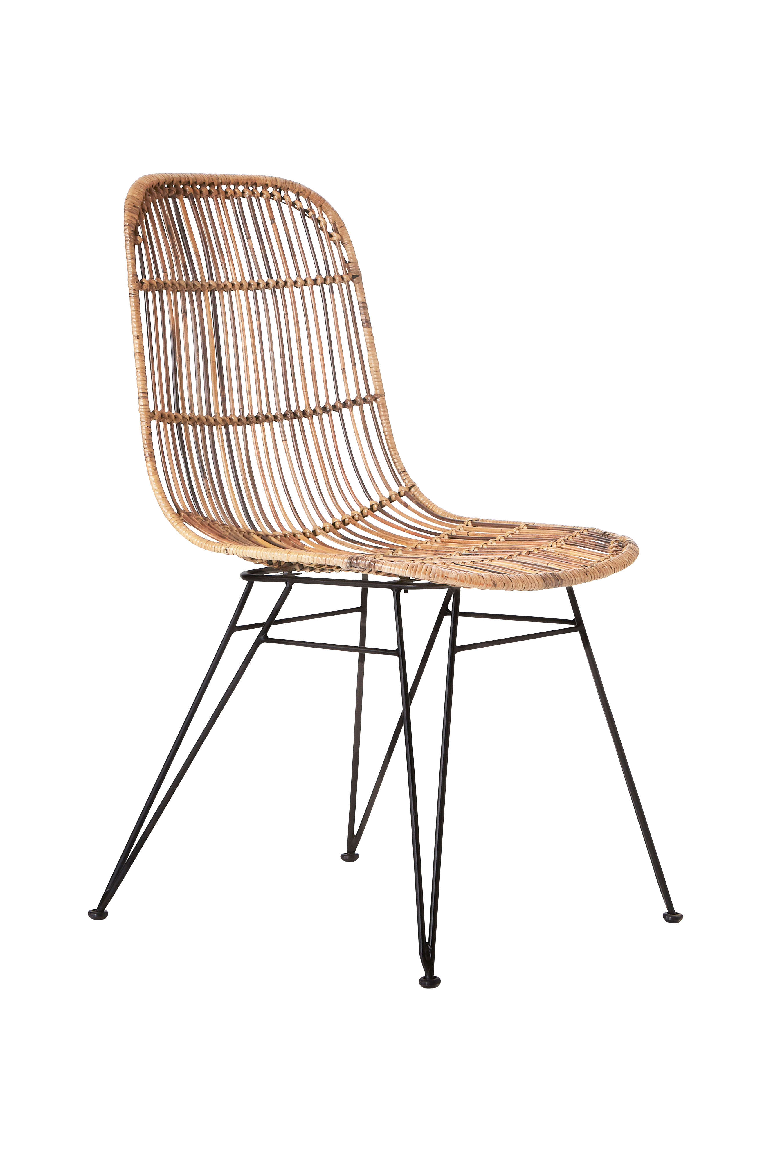 Kaksi rottinkituolia, mustat jalat jauhemaalattua metallia. Sopivat ulkotilaan.