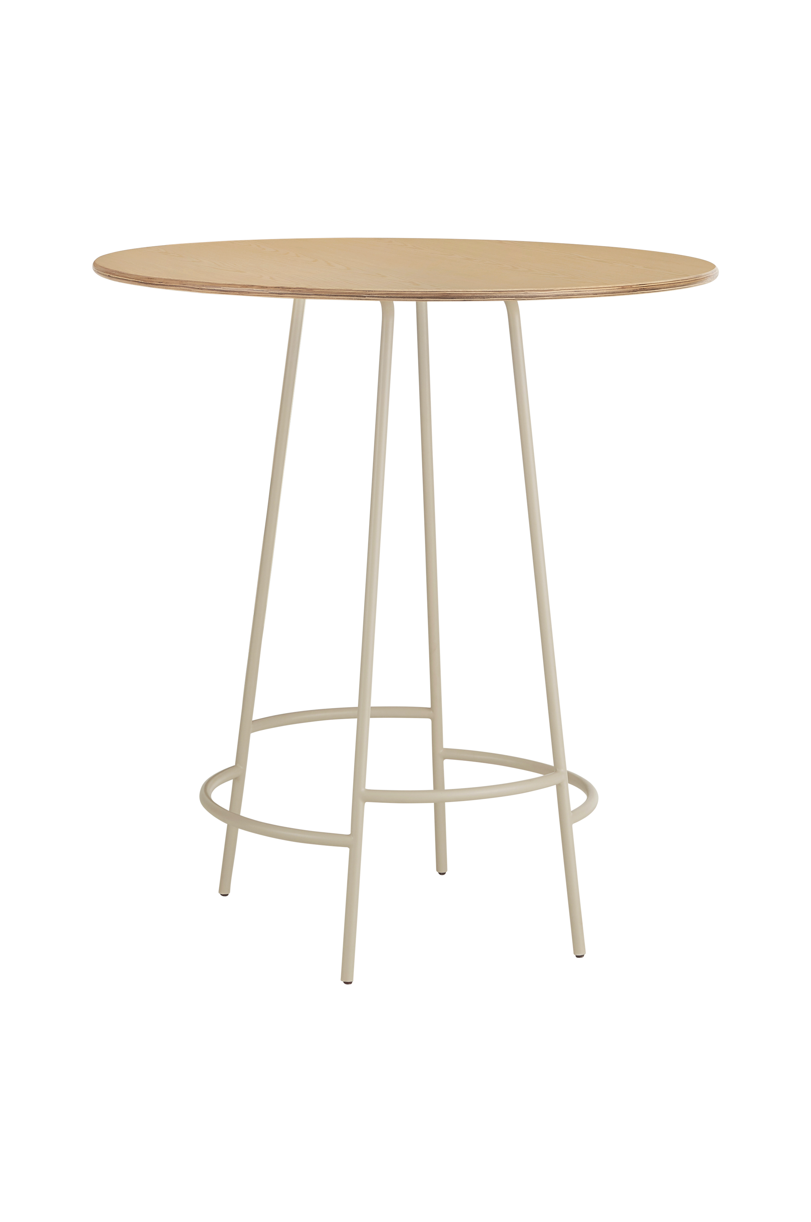 Baaripöytä, jonka pöytälevy laadukasta saarniviilutettua vaneria. Jalat jauhemaalattua metallia. Mitat: Korkeus 108 cm. Halkaisija 100 cm. Jalkatuet kahdella eri korkeudella: 22 cm ja 30 cm. Helppo koota.