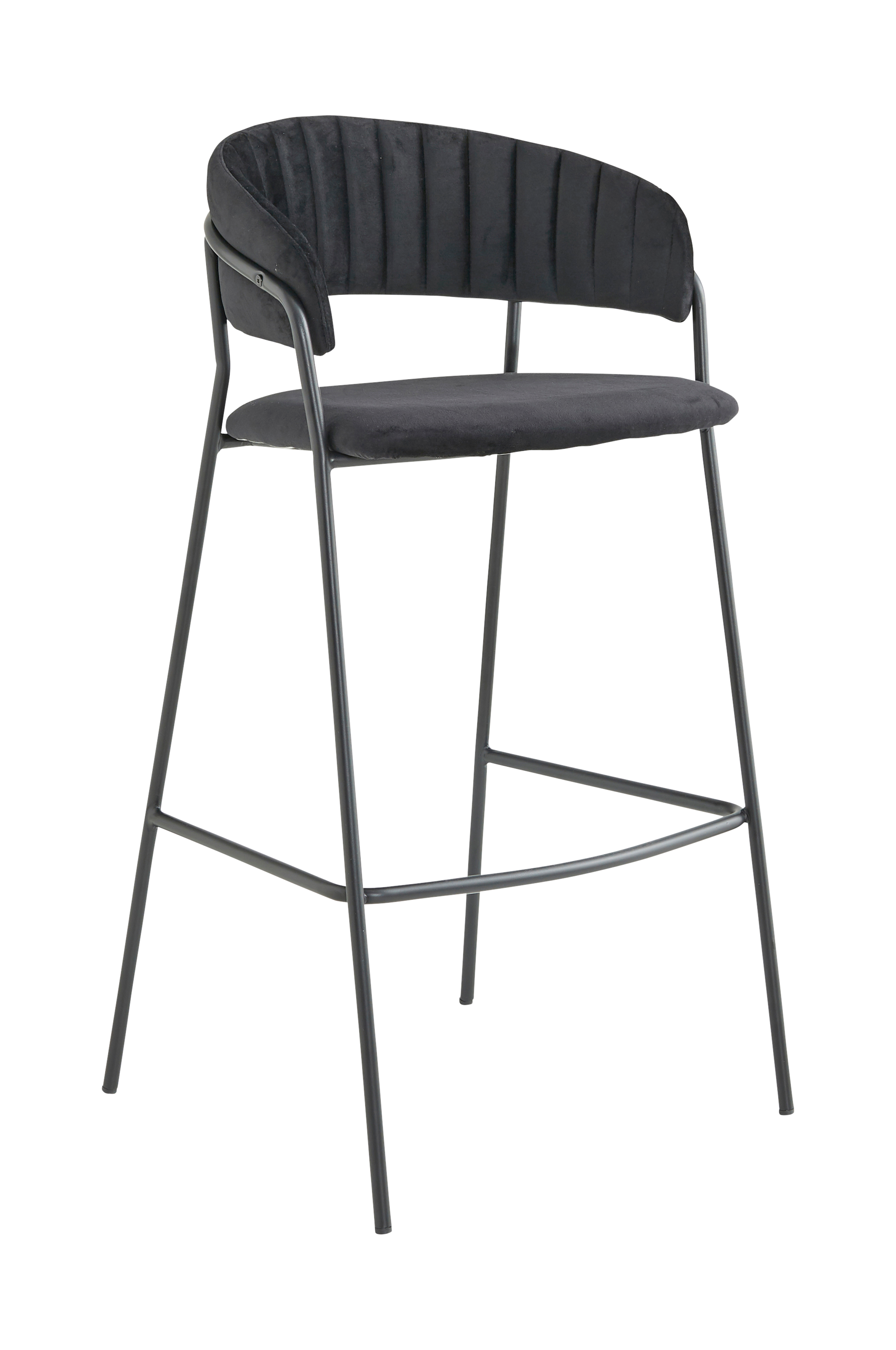 Baarituoli, jossa pehmustettu istuin ja selkänoja samettia. Koristesaumat selkänojan sisäpuolella muodostavat raitakuvion. Jalusta/jalat jauhemaalattua metallia. Mitat: Leveys 52 cm, korkeus 100 cm, syvyys 52 cm. Istuinkorkeus 75 cm, istuinsyvyys 43 cm. Etäisyys lattiasta käsinojaan 31 cm. Toimitetaan koottuna.