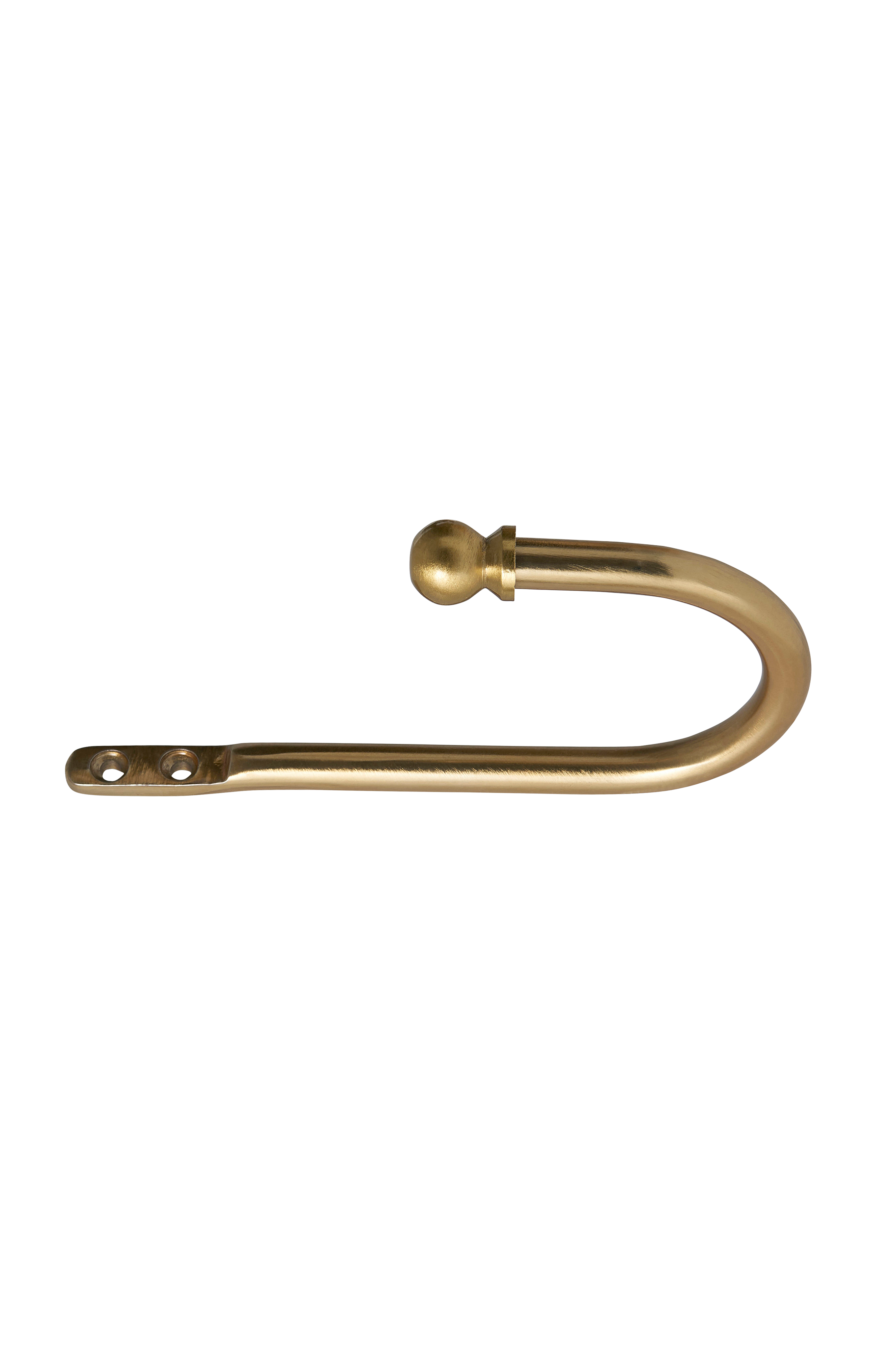 Ball-tamppikoukku messinginväristä metallia. Kuulanmuotoinen koriste. Sisältää ruuvit ja tulpat. Mitat: Leveys 17, korkeus 2, syvyys 8,5 cm.