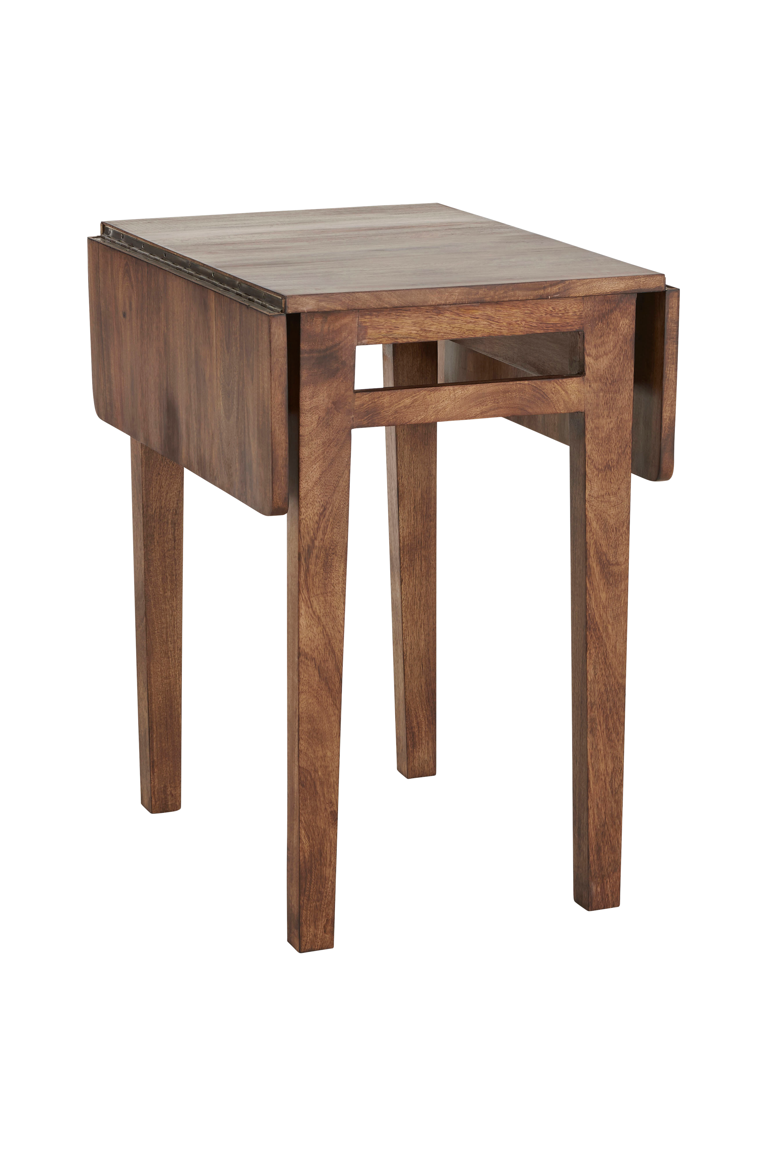 Mangopuinen Derri-klaffipöytä, jossa kaksi taittuvaa klaffia. Korkeus 72 cm. Pöytälevyn koko klaffit alhaalla 60 x 43,5 cm. Kummankin klaffin koko 60 x 22 cm. Pöytälevyn koko klaffit ylhäällä yhteensä 60 x 87,5 cm.