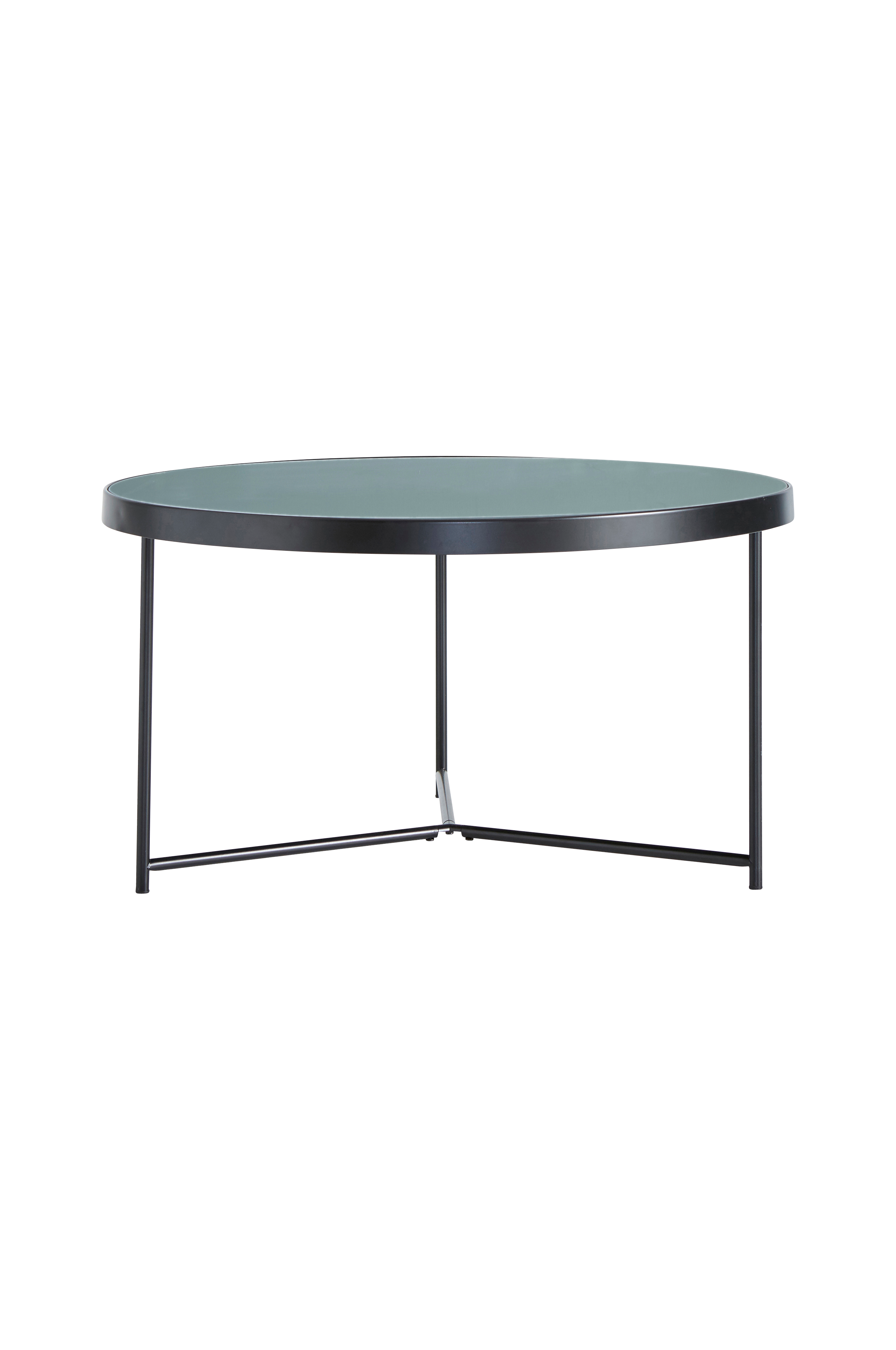 Pyöreä sohvapöytä. Runko metallia ja pöytälevy värjättyä, karkaistua lasia.
