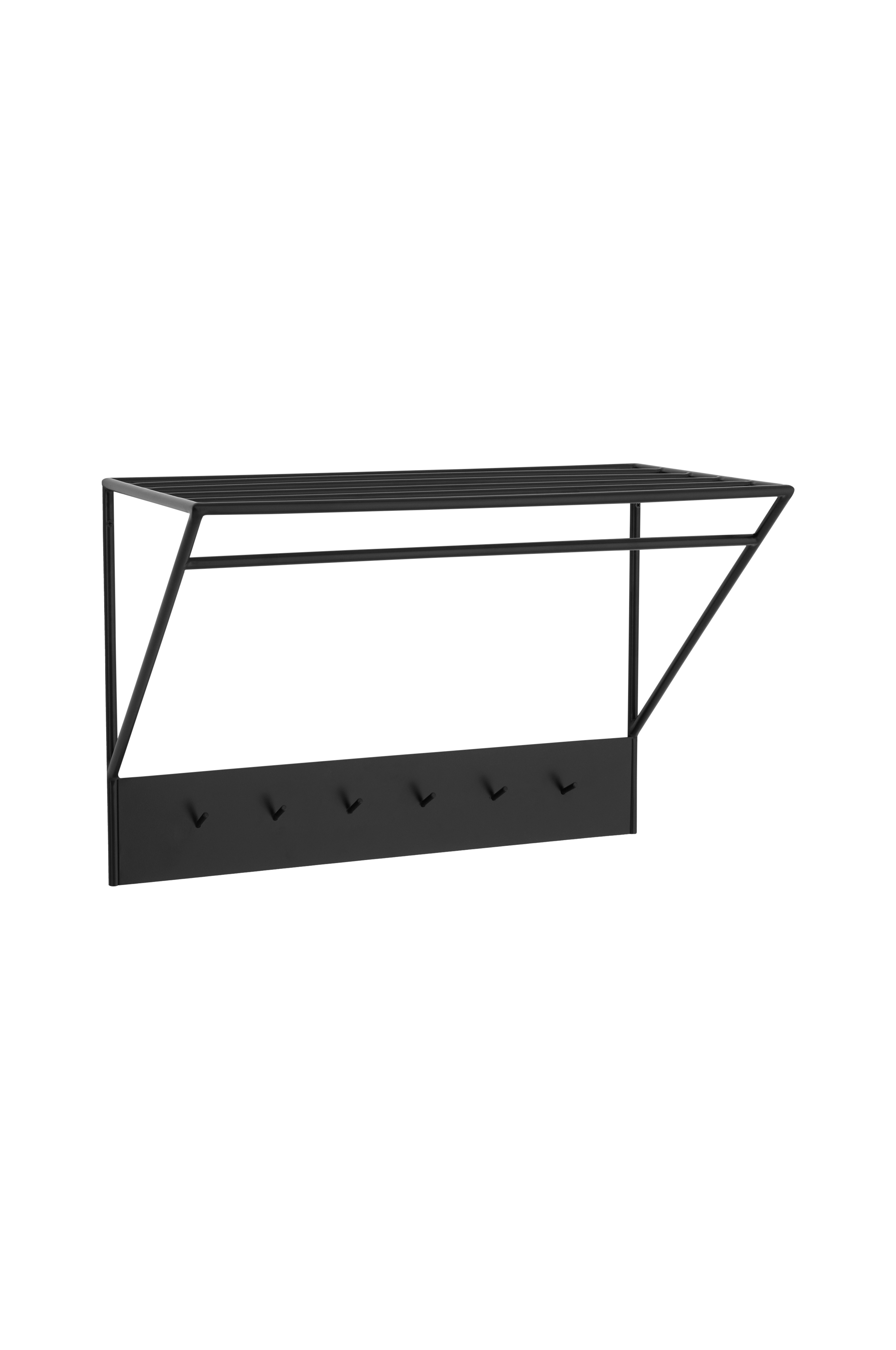 Hattuhylly jauhemaalattua metallia. Kuusi ripustuskoukkua.