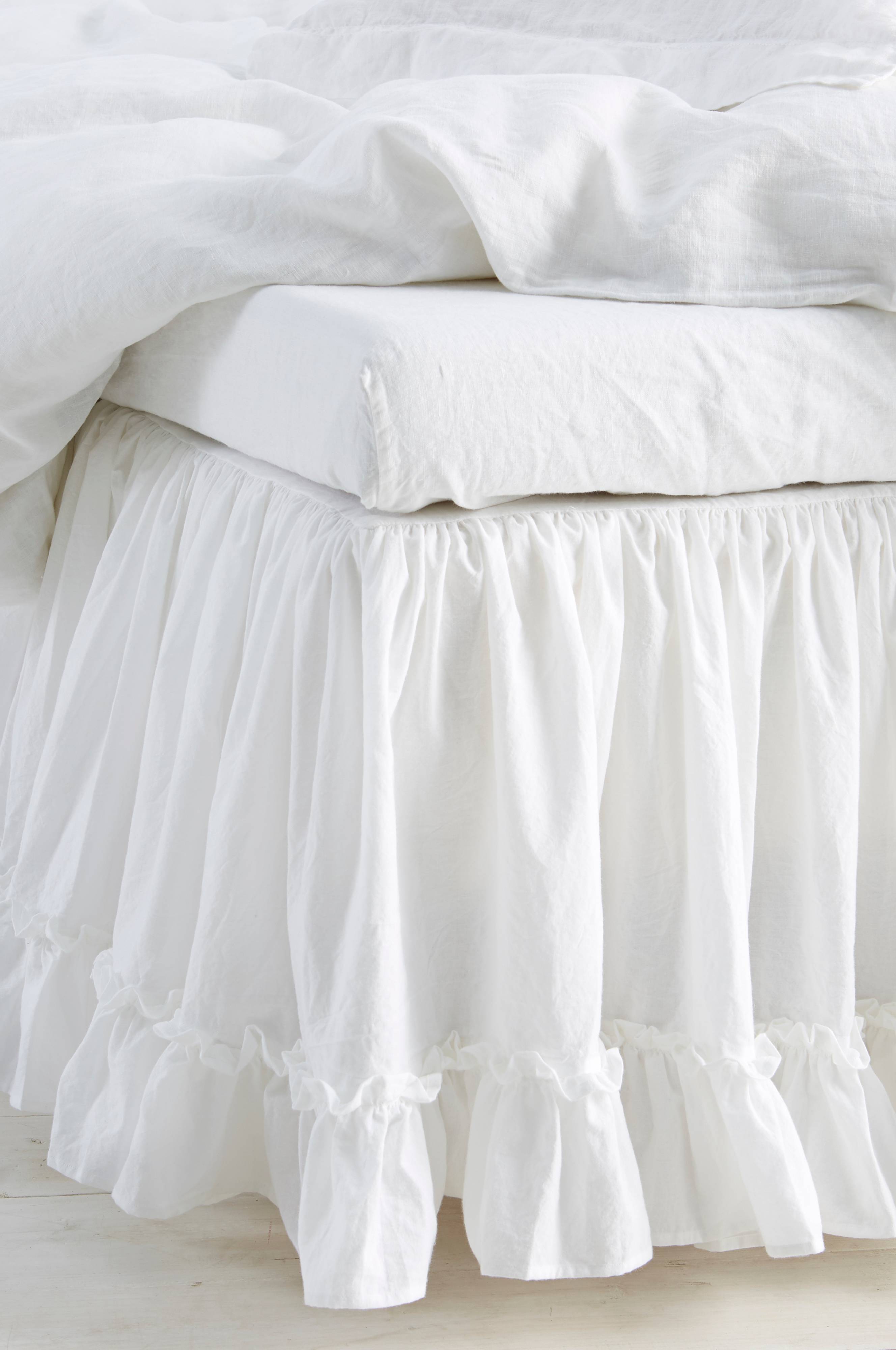 Helmalakana miellyttävää, pehmeäksi pestyä ekologista puuvillaa. Langantiheys 144 tc. Helman korkeus 45 cm. Poimutettu röyhelöreuna 13 cm helmassa kolmella sivulla. Toimitetaan kangaspussiin pakattuna. 4 kokoa: 90x200, 120x200, 160x200 ja 180x200 cm.