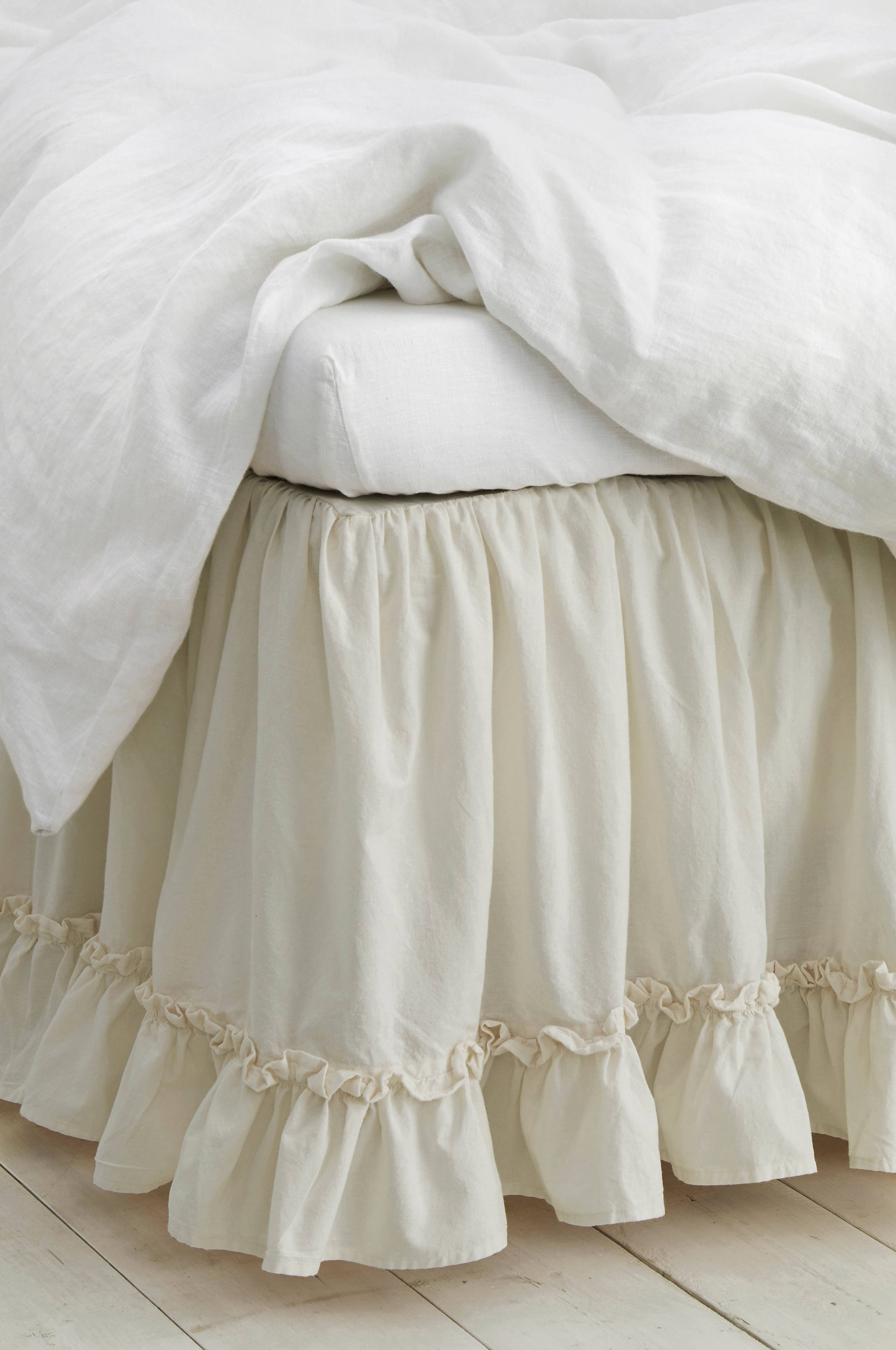 Helmalakana miellyttävää, pehmeäksi pestyä ekologista puuvillaa. Langantiheys 144 tc. Helman korkeus 45 cm. Poimutettu röyhelöreuna 13 cm helmassa kolmella sivulla. Toimitetaan kangaspussiin pakattuna. 4 kokoa: 90x200, 120x200, 160x200 ja 180x200 cm.