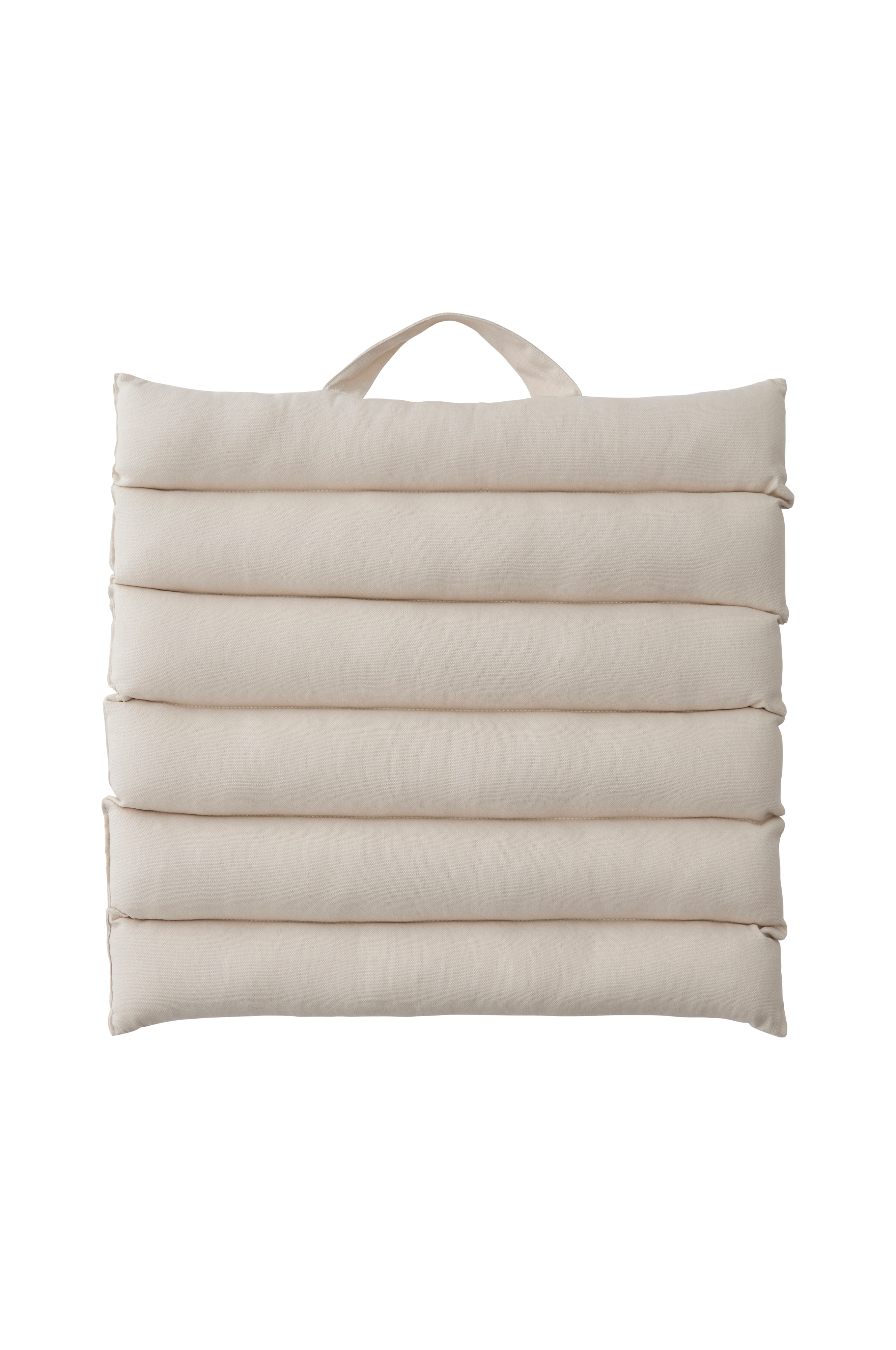 Istuintyyny puuvillaa. Ommellut kujat. Kahva toisella lyhyellä sivulla. Täyte kierrätettyä polyesteriä. Koko 45x45 cm. Paksuus 3 cm.