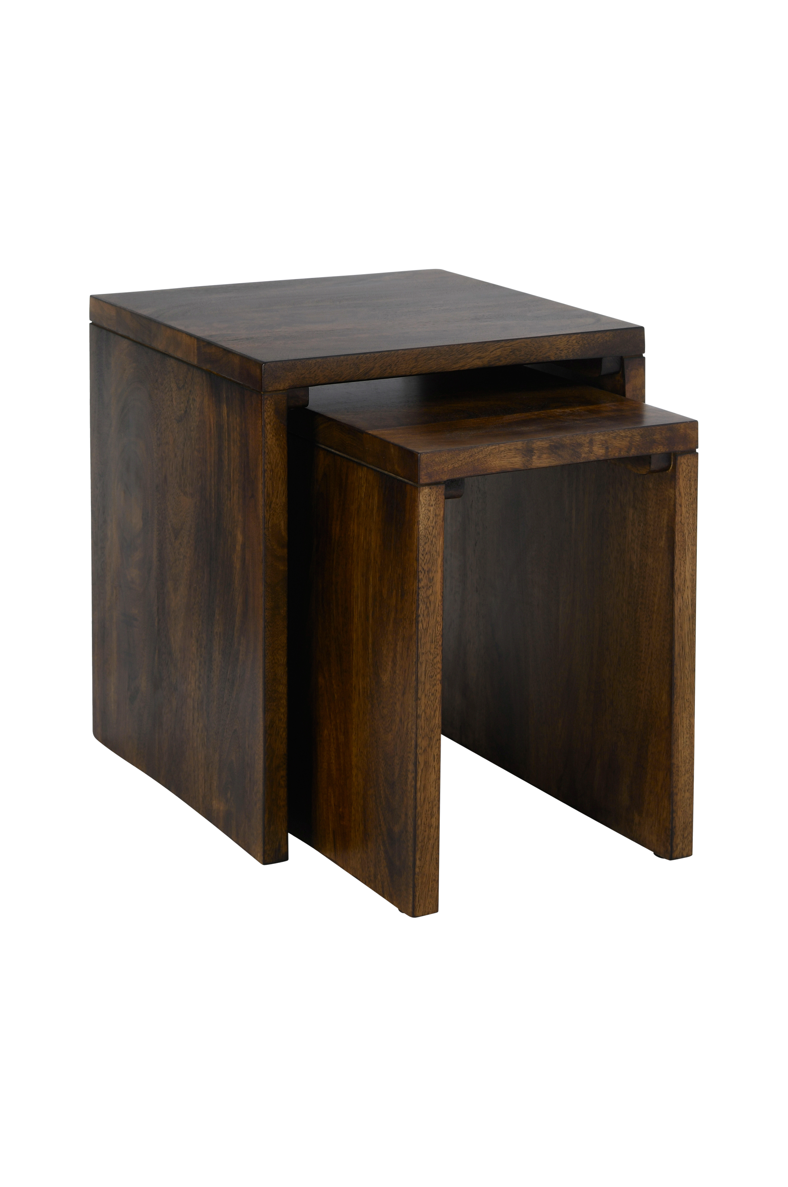 Kaksi erikokoista jakkaraa, joilla on monta käyttöaluetta. Niitä voidaan käyttää myös pöytinä, erikseen tai yhdessä. Massiivista mangopuuta, jossa tummaksi vahattu pinta.