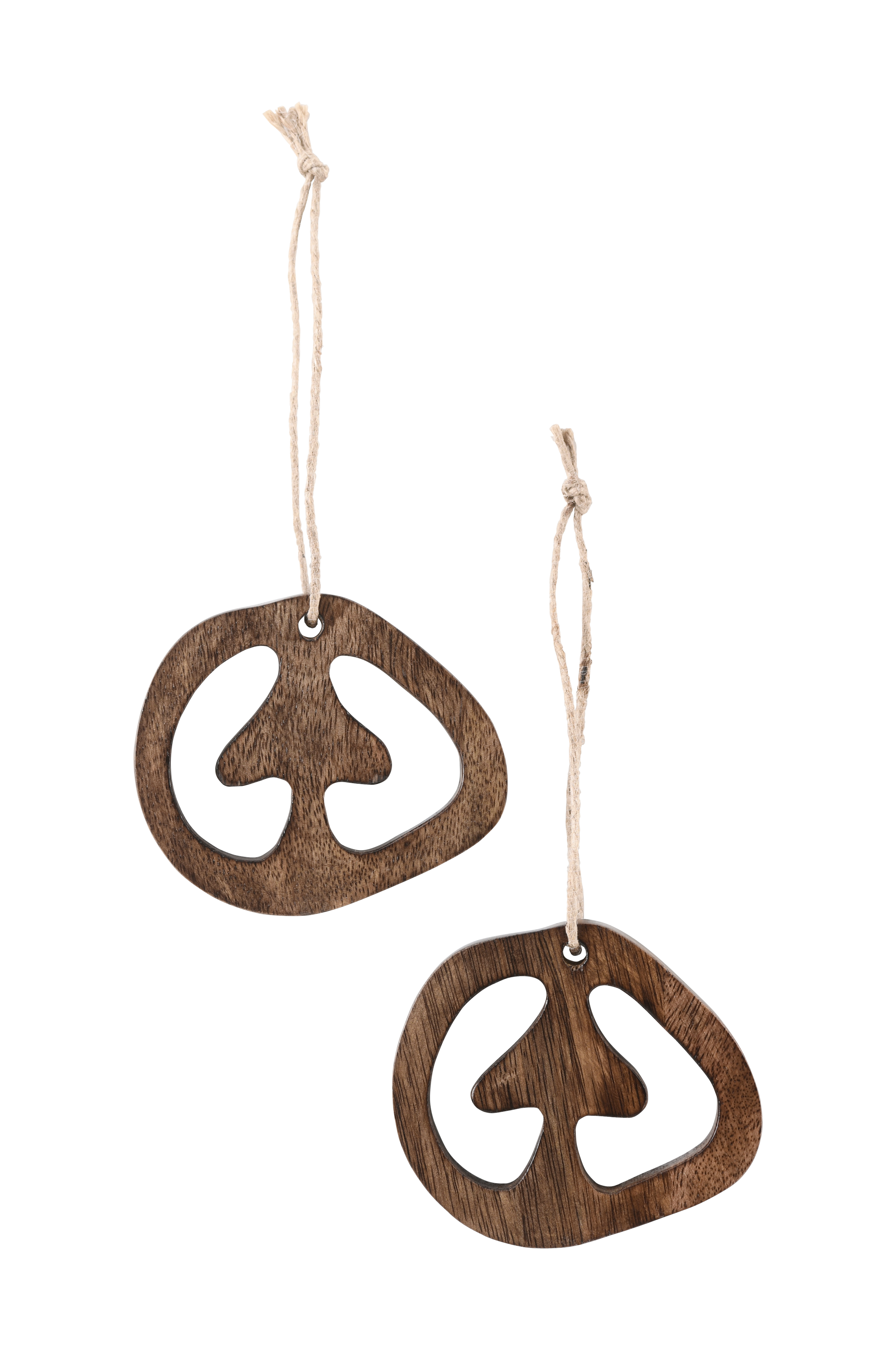 Joulukuusenkoristeet, 2/pakkaus. Mangopuuta, jossa ruskeaksi petsattu viimeistely. Leveys 9 cm, korkeus 7,5 cm, syvyys 1 cm. Ripustusnaru.