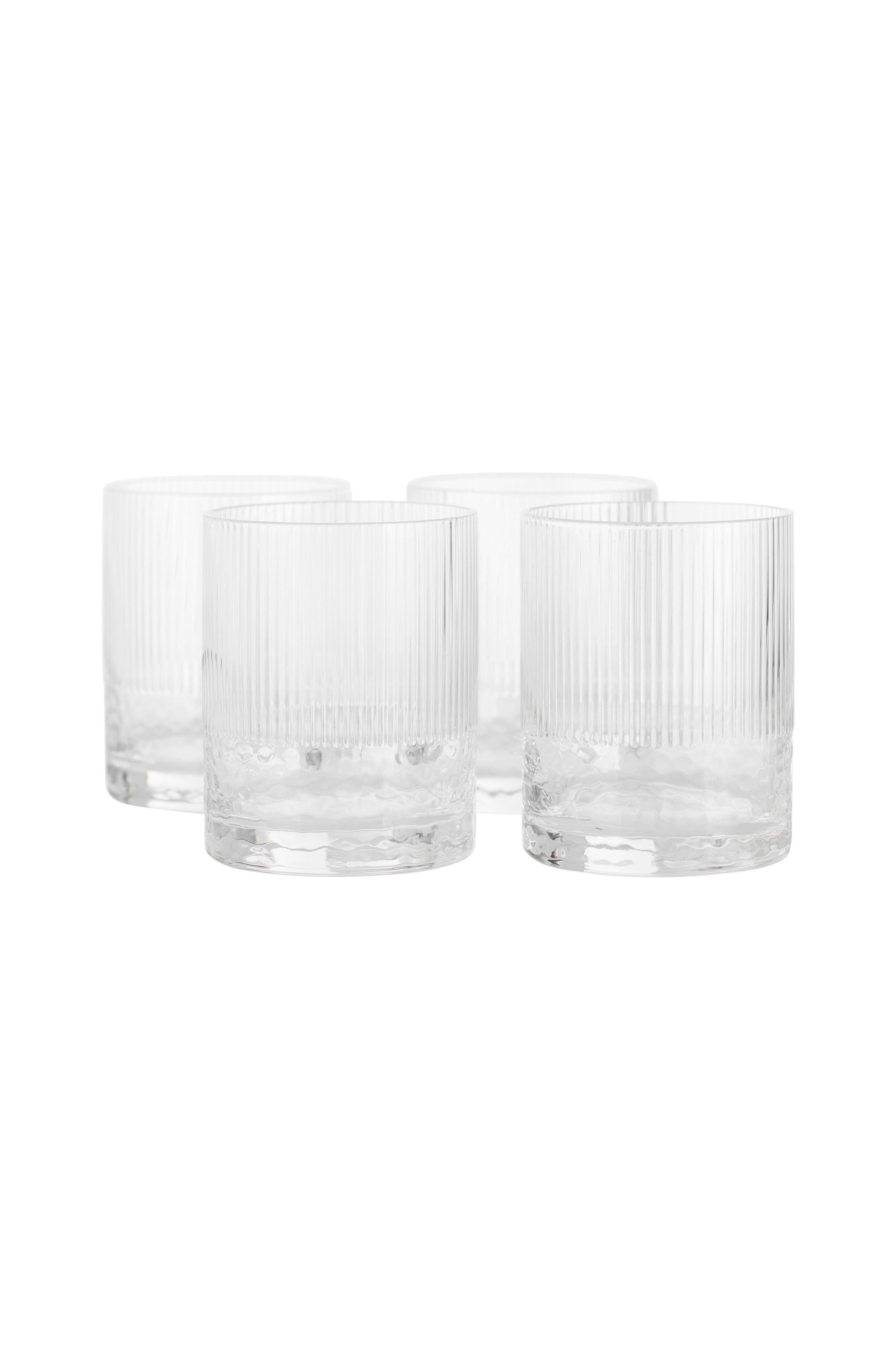 Juomalasit, joissa uurrettu pinta ylhäällä ja koristeellinen pintakuvio alhaalla. Vetoisuus: 360 ml.