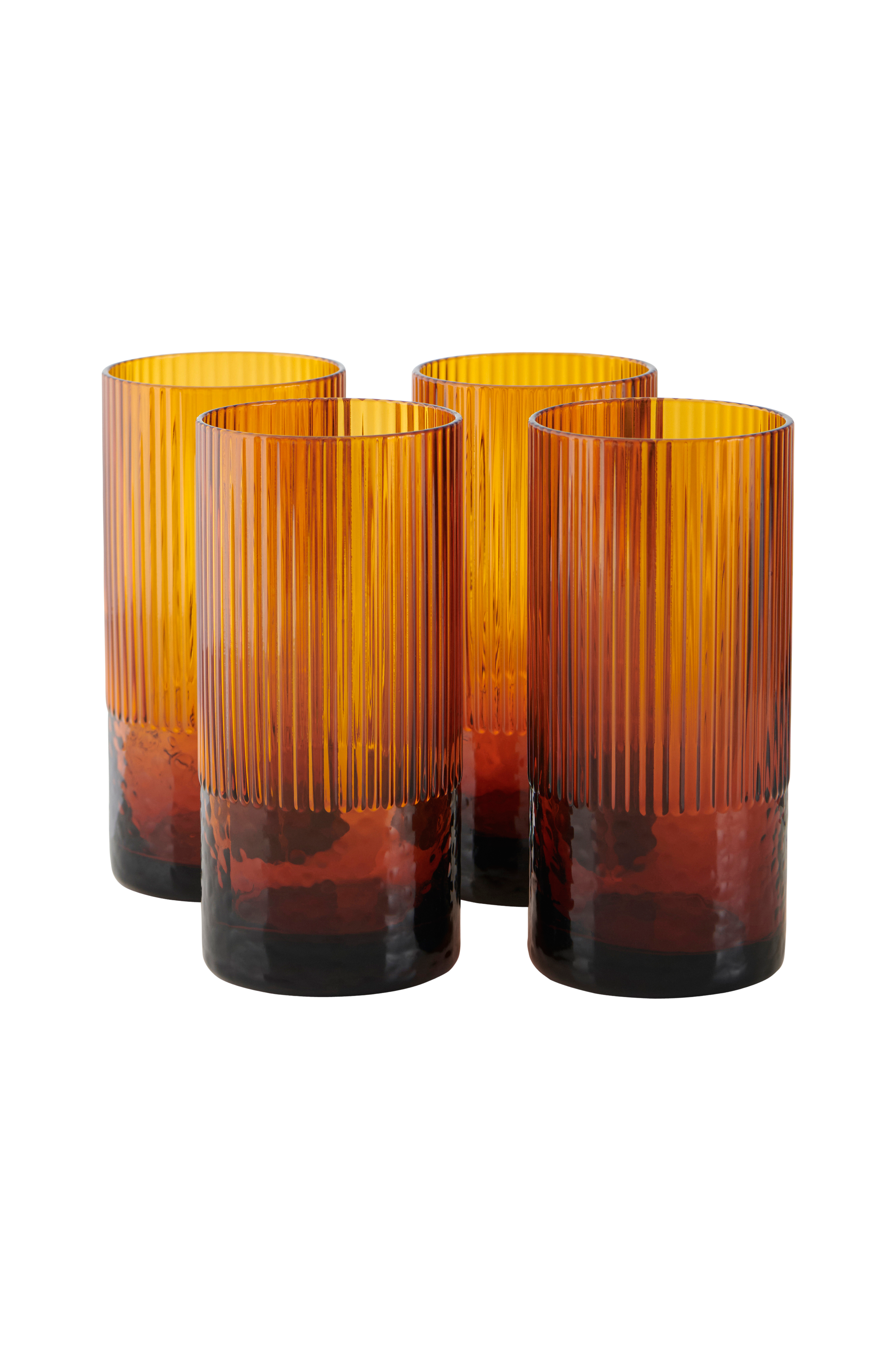 Juomalasit, joissa uurrettu pinta ylhäällä ja koristeellinen pintakuvio alhaalla. Vetoisuus: 460 ml.