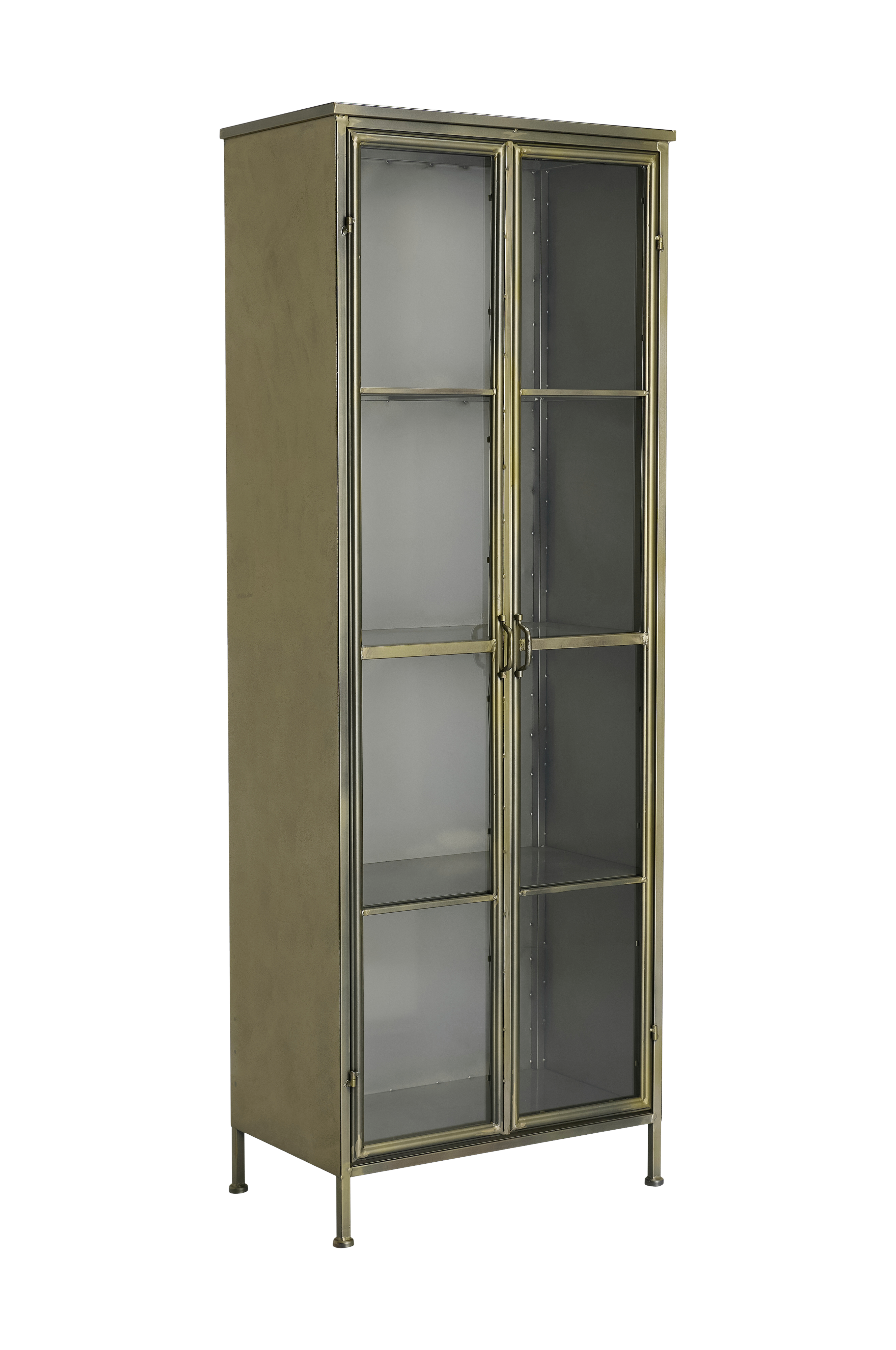 Metallinen kaappi, jossa kolme kiinteää hyllytasoa. Kaksi ovea metallia ja lasia, magneettilukot. Hyllytasot terästä.
