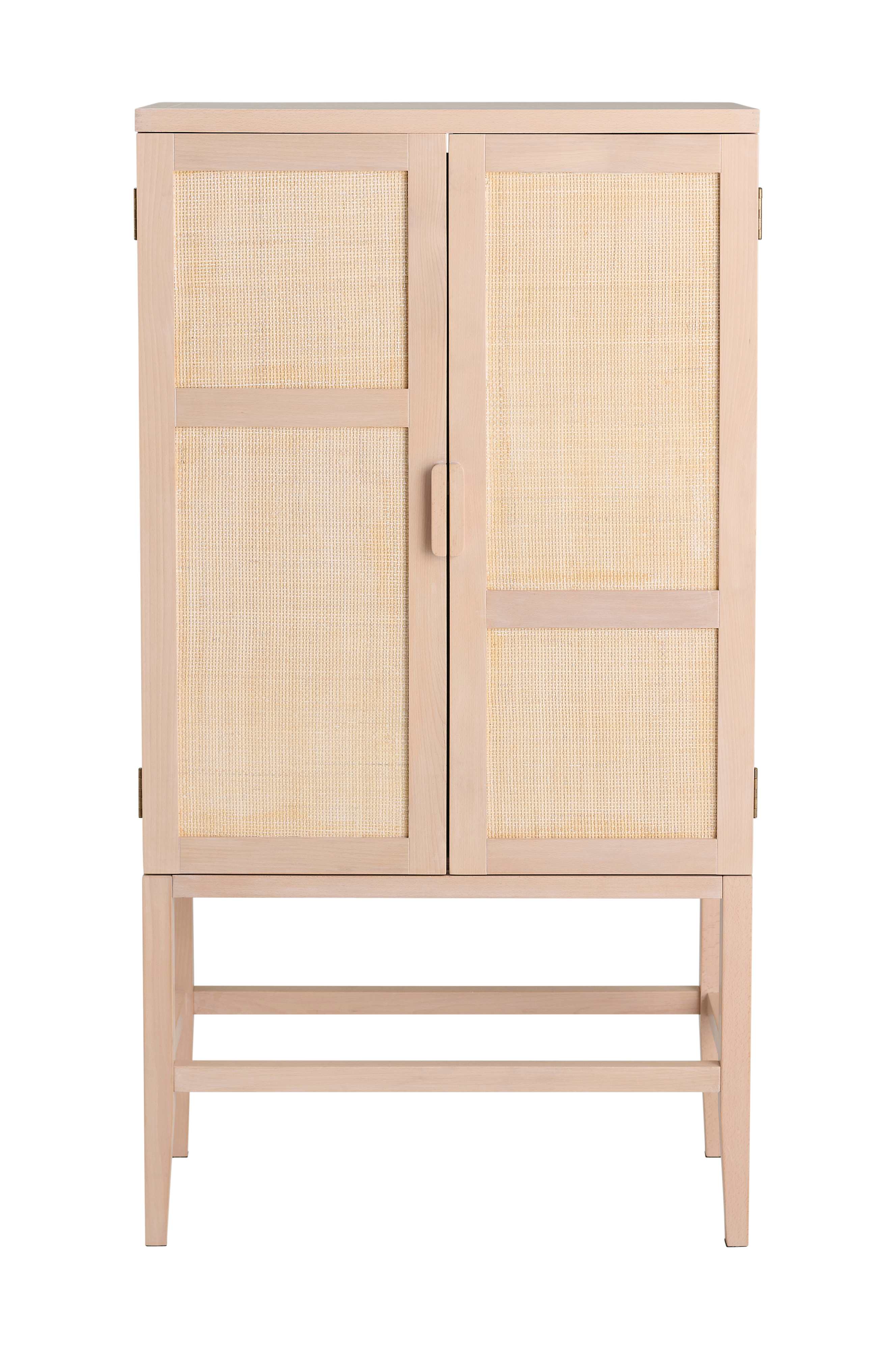 Tukeva säilytyskaappi tyylikkäällä muotoilulla, jonka ovissa on rottinkia. Ihanteellinen vaatteiden, kirjojen tai muiden kotitaloustavaroiden säilytykseen.