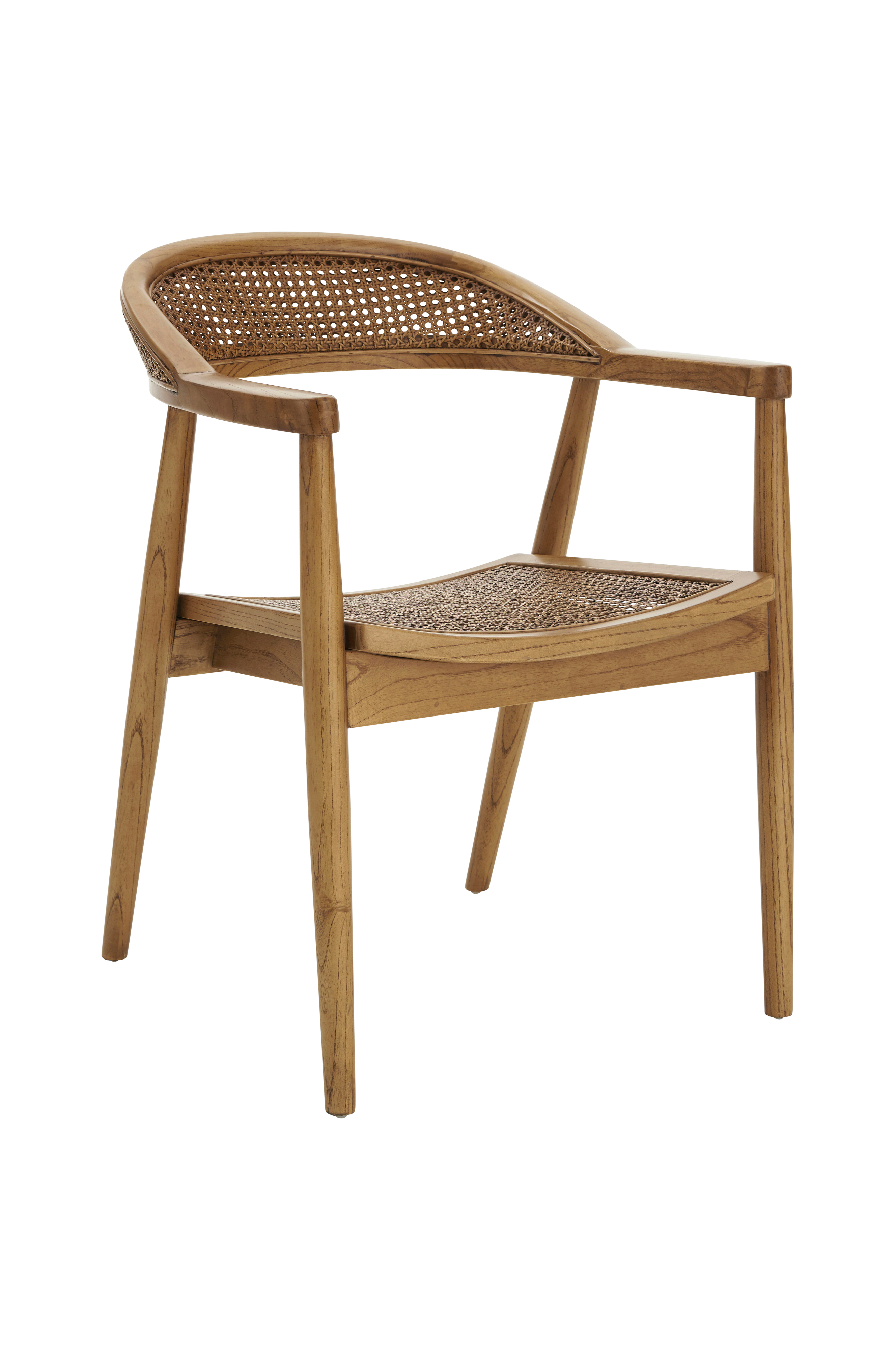 Käsinojallinen tuoli jalavaa, istuin ja selkänoja kaksipuolisesti punottua rottinkia. Mitat: Leveys 58 cm, korkeus 77 cm, syvyys 60 cm. Istuinkorkeus 43 cm, istuinsyvyys 43 cm, istuinleveys 48 cm. Käsinojan korkeus 66 cm.