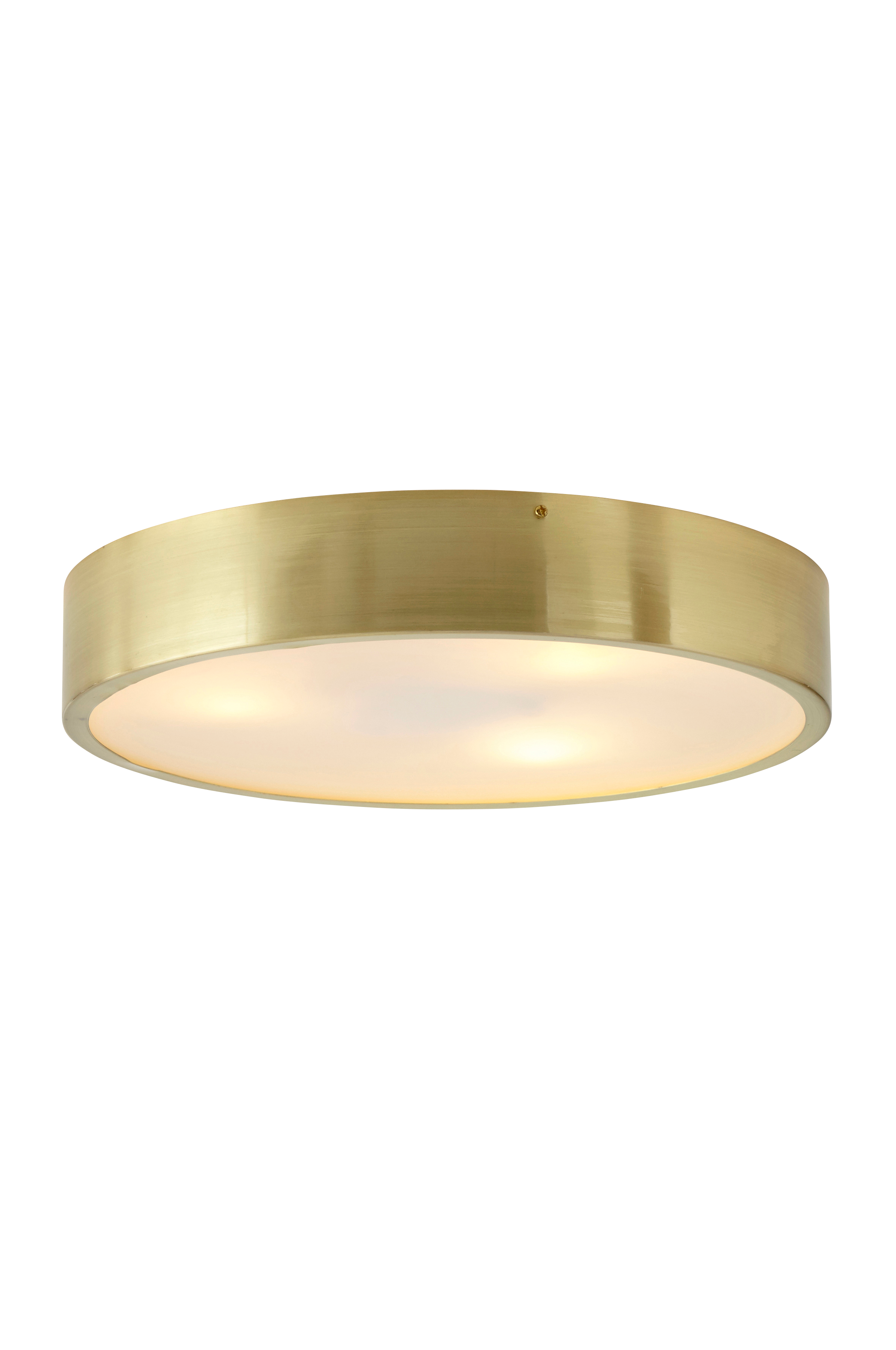 Kattoplafondi metallia, jossa harjattu pinta ja huurrelasilevy. Ø 40 cm. Korkeus 7 cm. Pieni lampunkanta, 3xE14. Enintään 40 W.