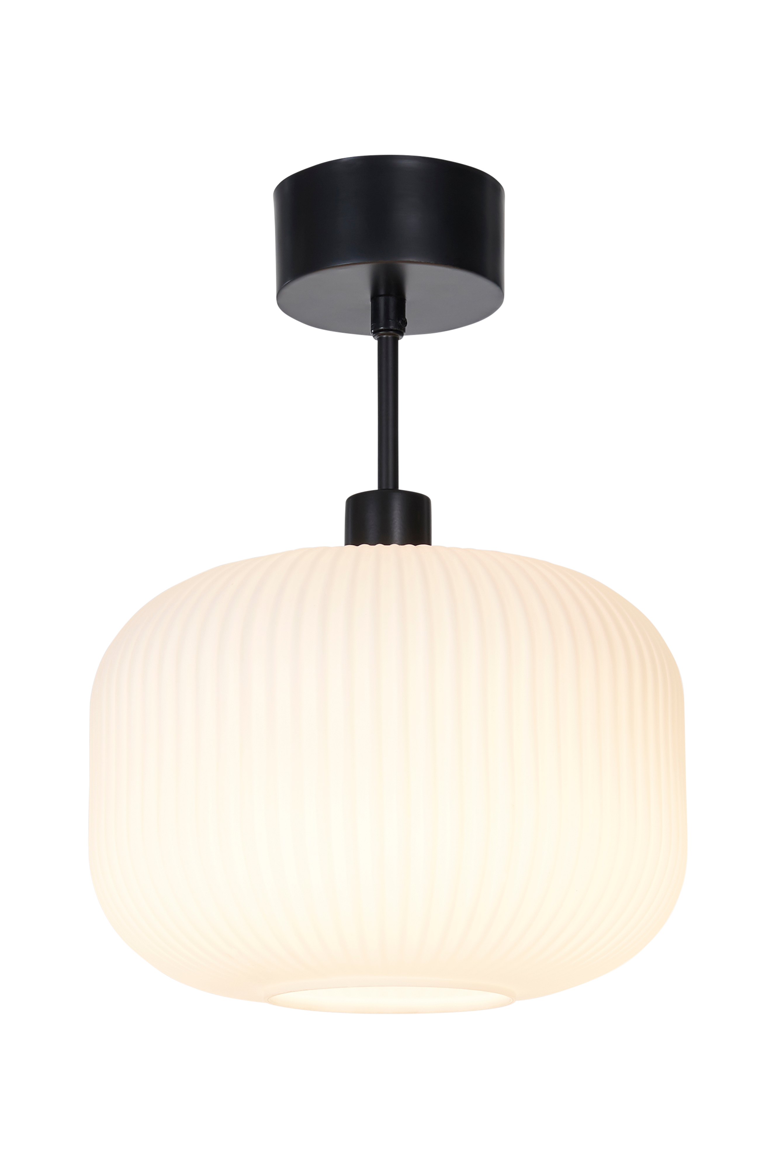 Kattoplafondi, jossa pyöristetty lasikupu ja uurrettu pinta. Kattokiinnike ja yksityiskohdat metallia. Valaisimen kokonaiskorkeus kattokiinnikkeen kanssa n. 45 cm. Lasikuvun mitat: Halkaisija 30 cm, korkeus 23 cm. Kattokuppi ja ripustuskoukku. Iso E27-lampunkanta. Valonlähde enintään 25 W. Valonlähde ei sisälly toimitukseen.
