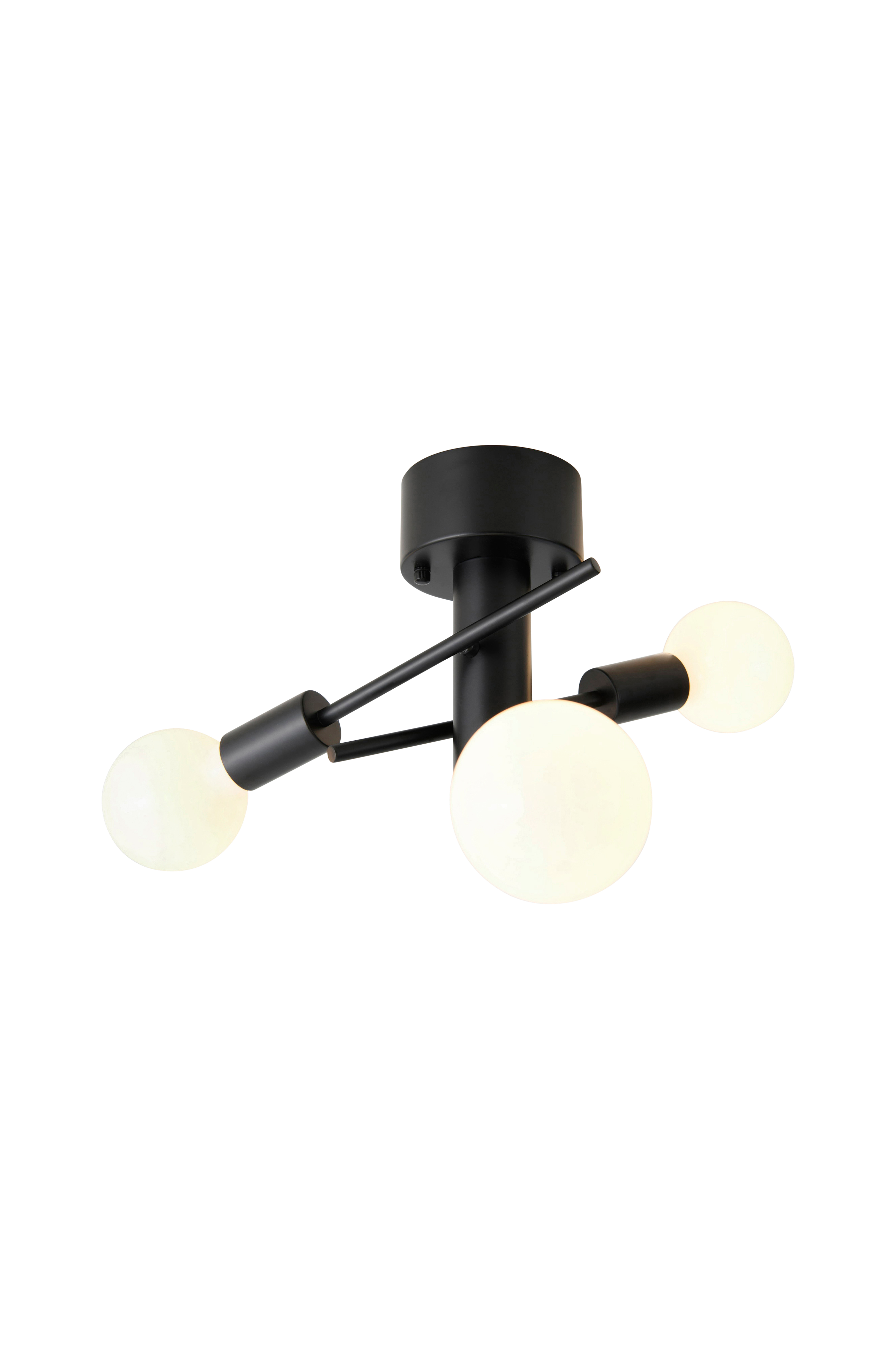 Metallinen kattovalaisin/kattoplafondi, jossa 3 kiinteää vartta. Pituus/varsi 27,5 cm. Kokonaiskorkeus katosta n. 23 cm. Kokonaishalkaisija 37 cm. Metallisen kattokupin Ø 12 cm, korkeus 6 cm. Asennetaan kattokiinnikkeen avulla. Lampunkanta 3 x E27. Enintään 25 W.